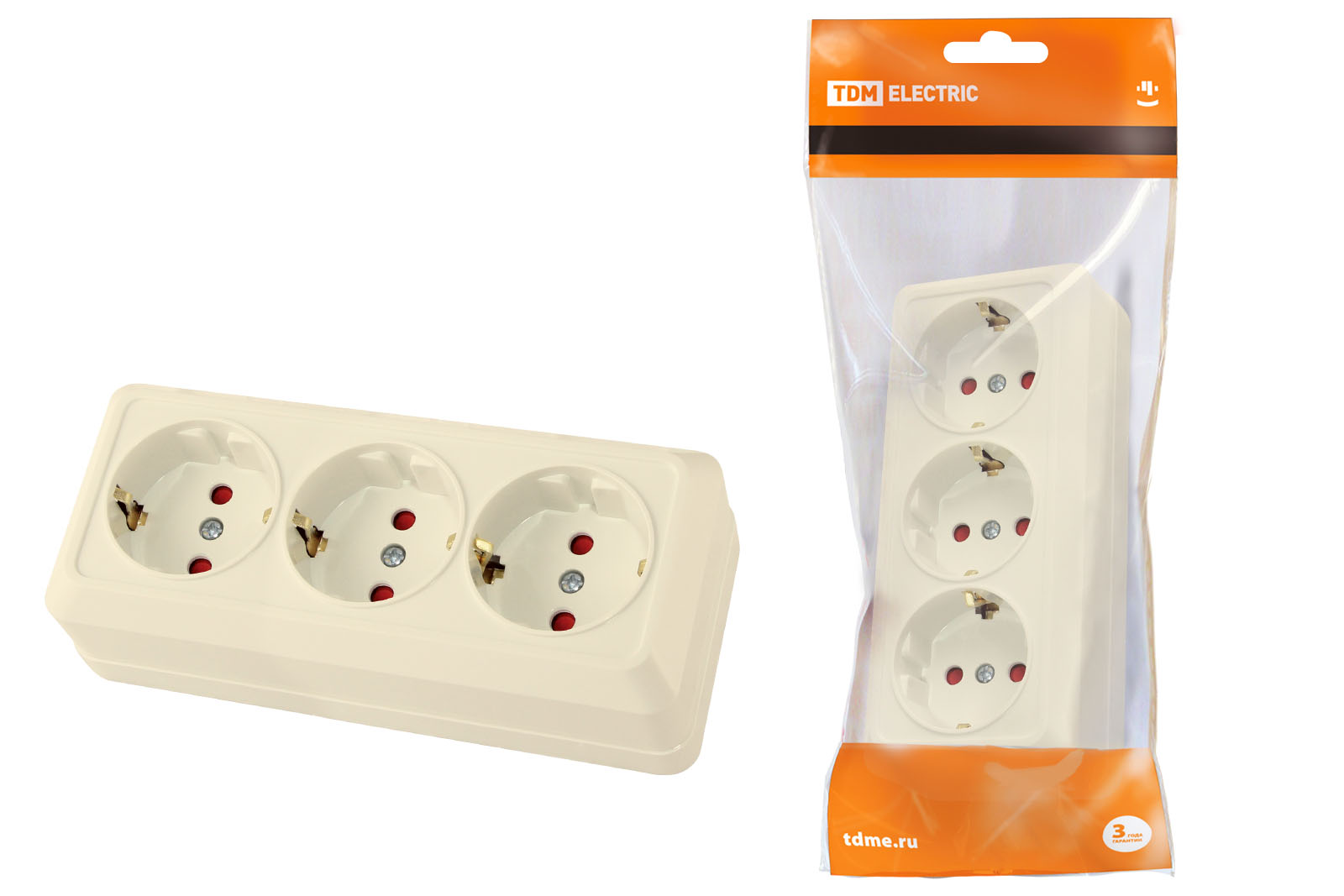 Розетка 3-х местная горизонтальная 2П+3 открытой установки IP20 16A с з/ш сл. кость "Ладога" TDM