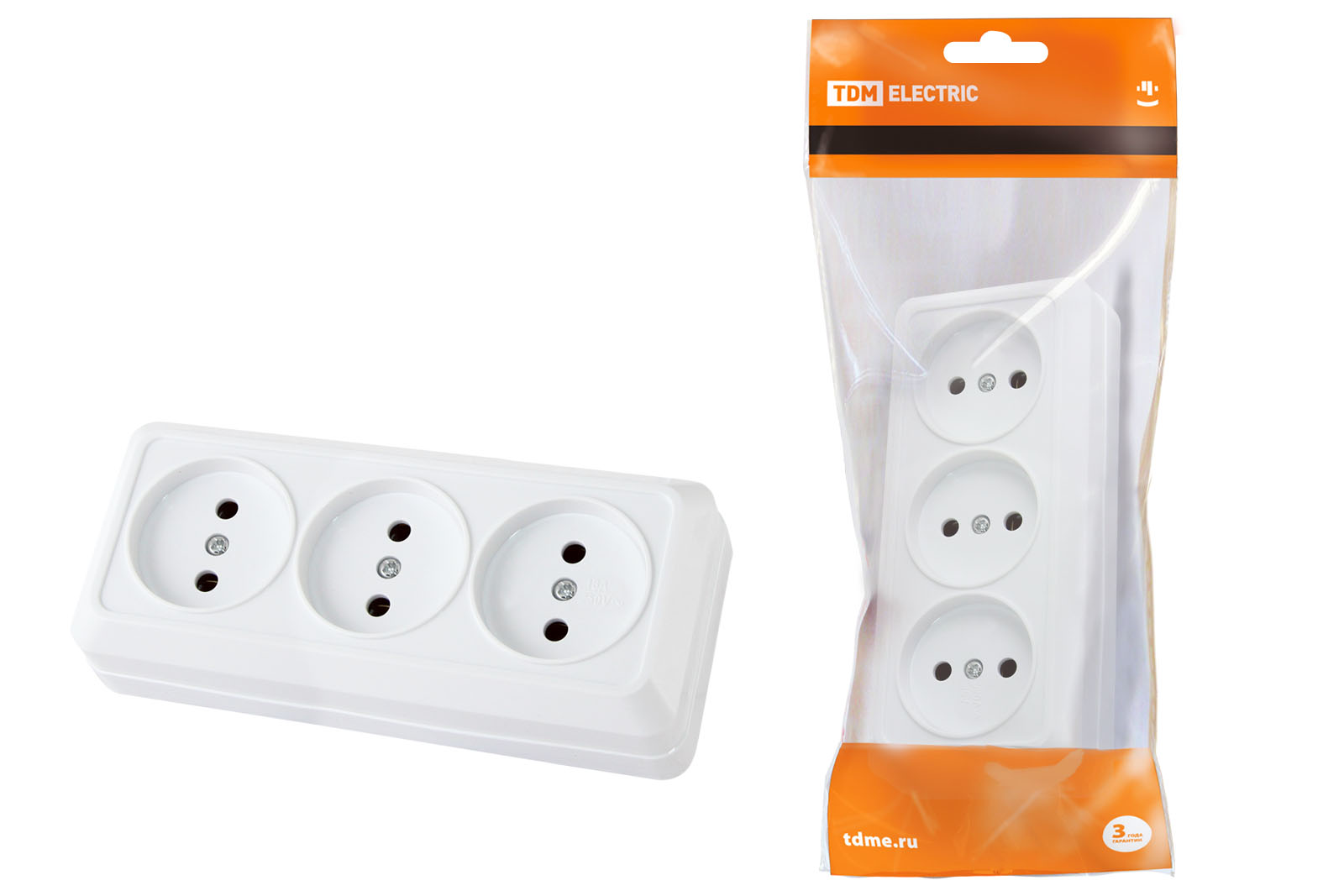 Розетка 3-х местная горизонтальная 2П открытой установки IP20 10A белая "Ладога" TDM