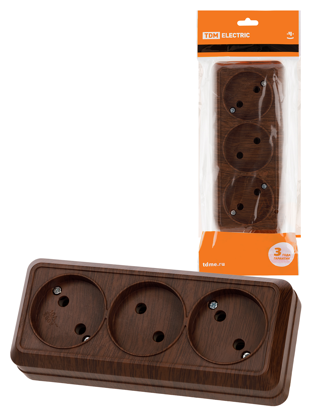 Розетка 3-х местная горизонтальная 2П открытой установки IP20 10A бук "Ладога" TDM