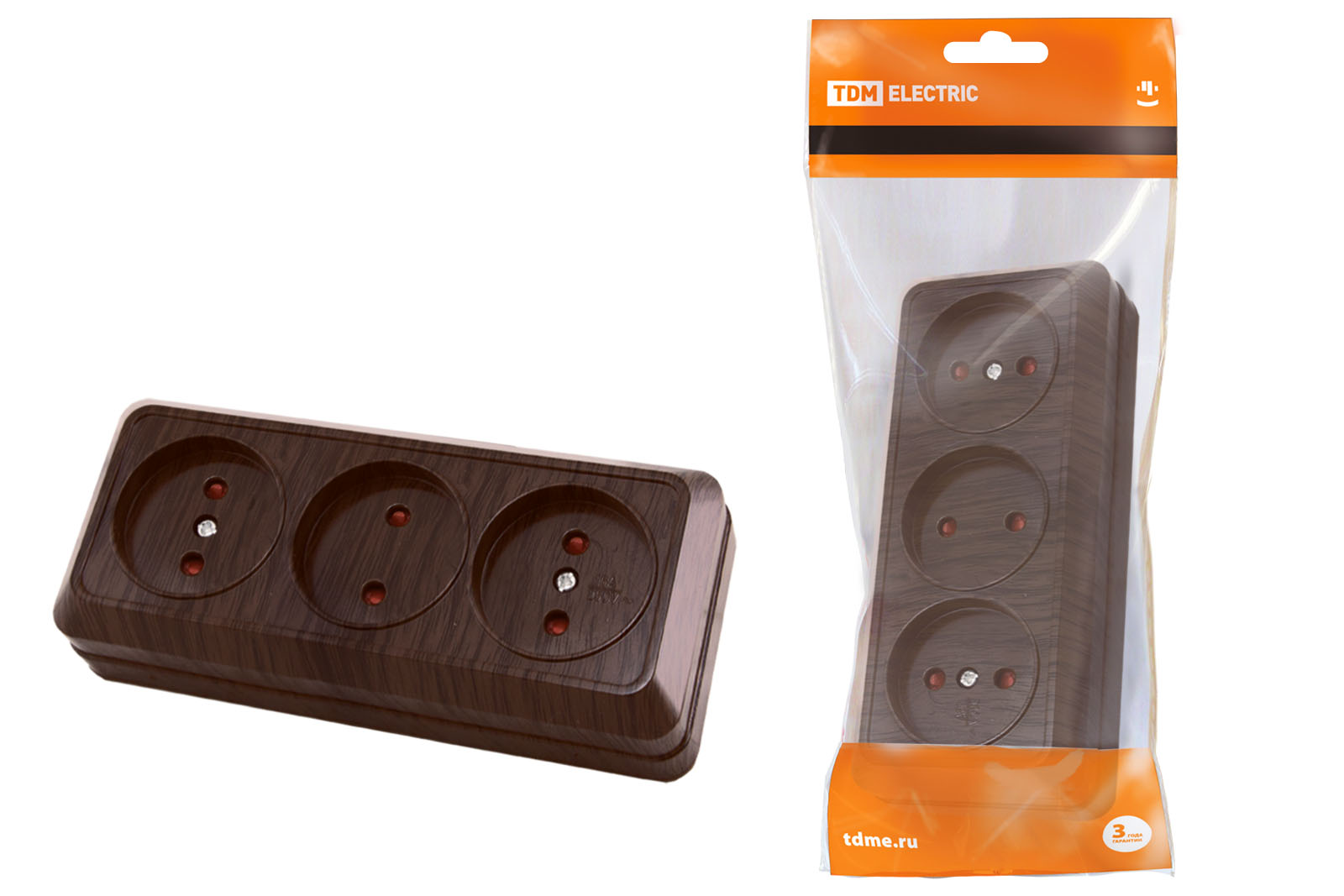 Розетка 3-х местная горизонтальная 2П открытой установки IP20 10A с з/ш бук "Ладога" TDM