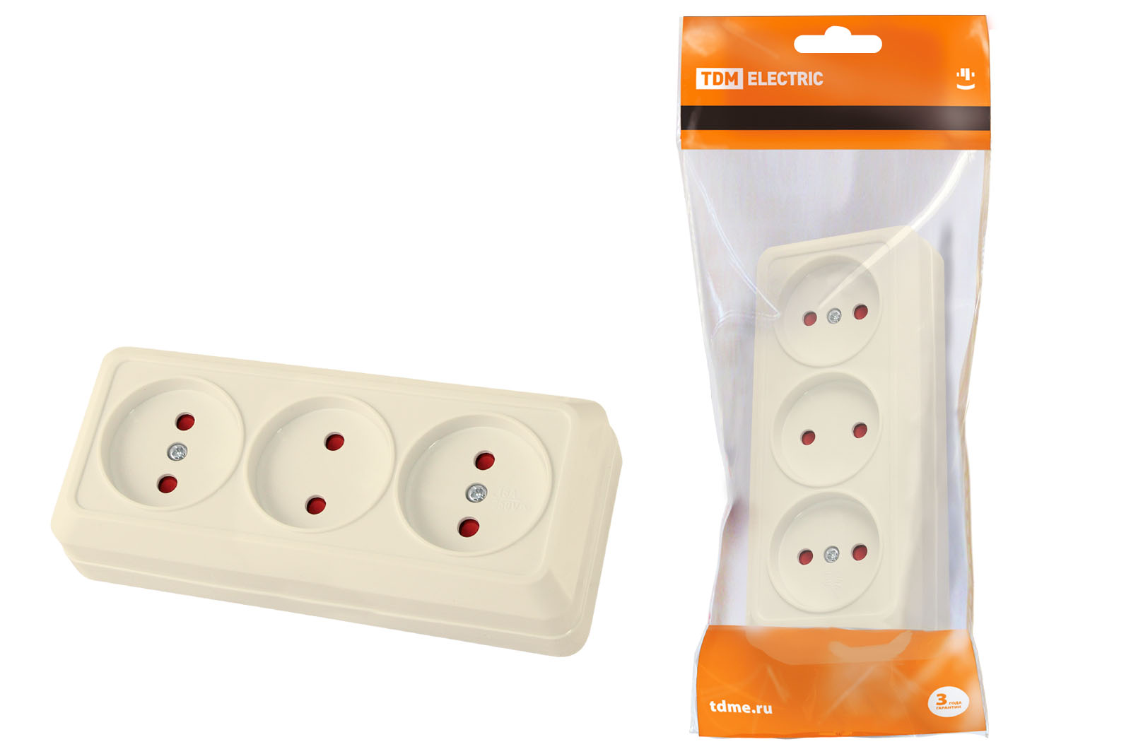 Розетка 3-х местная горизонтальная 2П открытой установки IP20 10A с з/ш сл. кость "Ладога" TDM