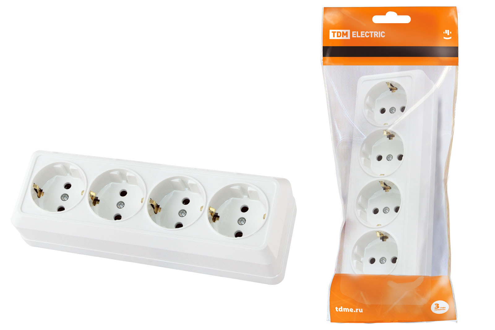 Наименование: Розетка 4-х местная горизонтальная 2П+3 открытой установки IP20 16A белая "Ладога" TDM