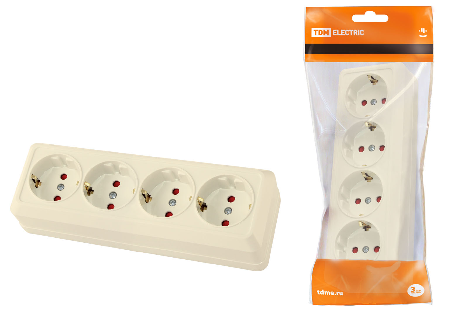Наименование: Розетка 4-х местная горизонтальная 2П+3 открытой установки IP20 16A с з/ш сл. кость "Ладога" TDM