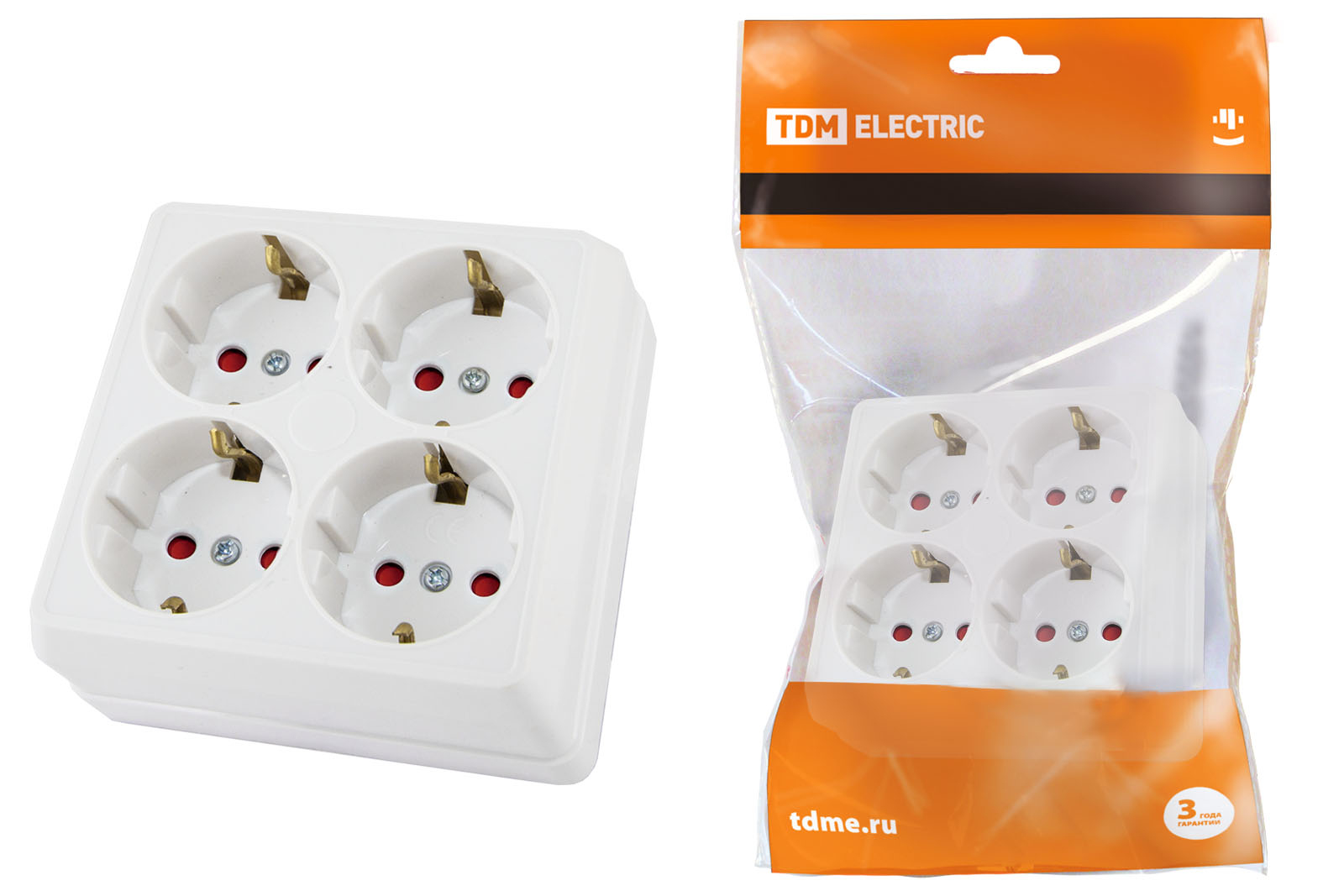 Наименование: Розетка четырехместная 2П+3 открытой установки IP20 16A с защитными шторками белая "Ладога" TDM