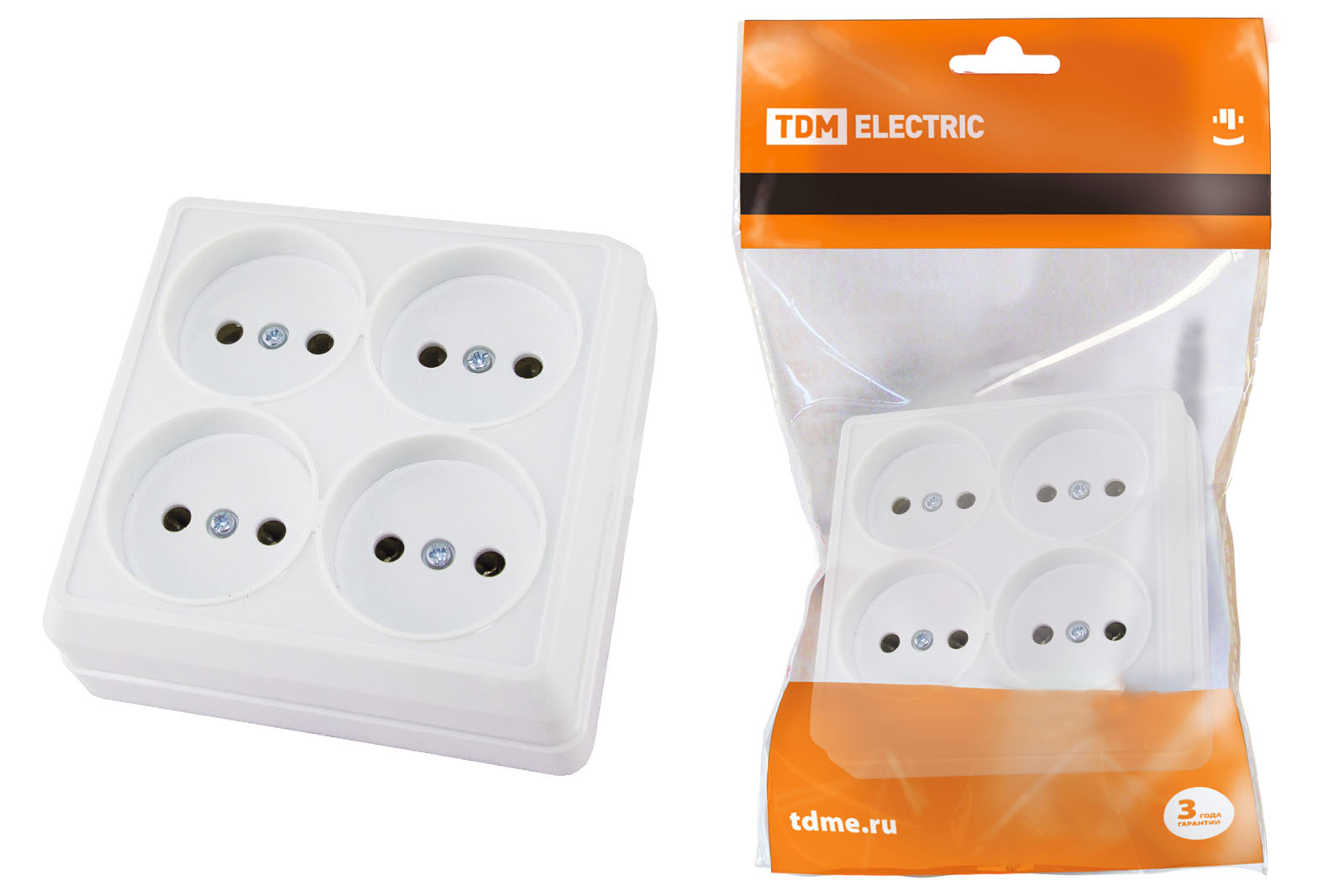 Наименование: Розетка четырехместная 2П открытой установки IP20 10A белая "Ладога" TDM