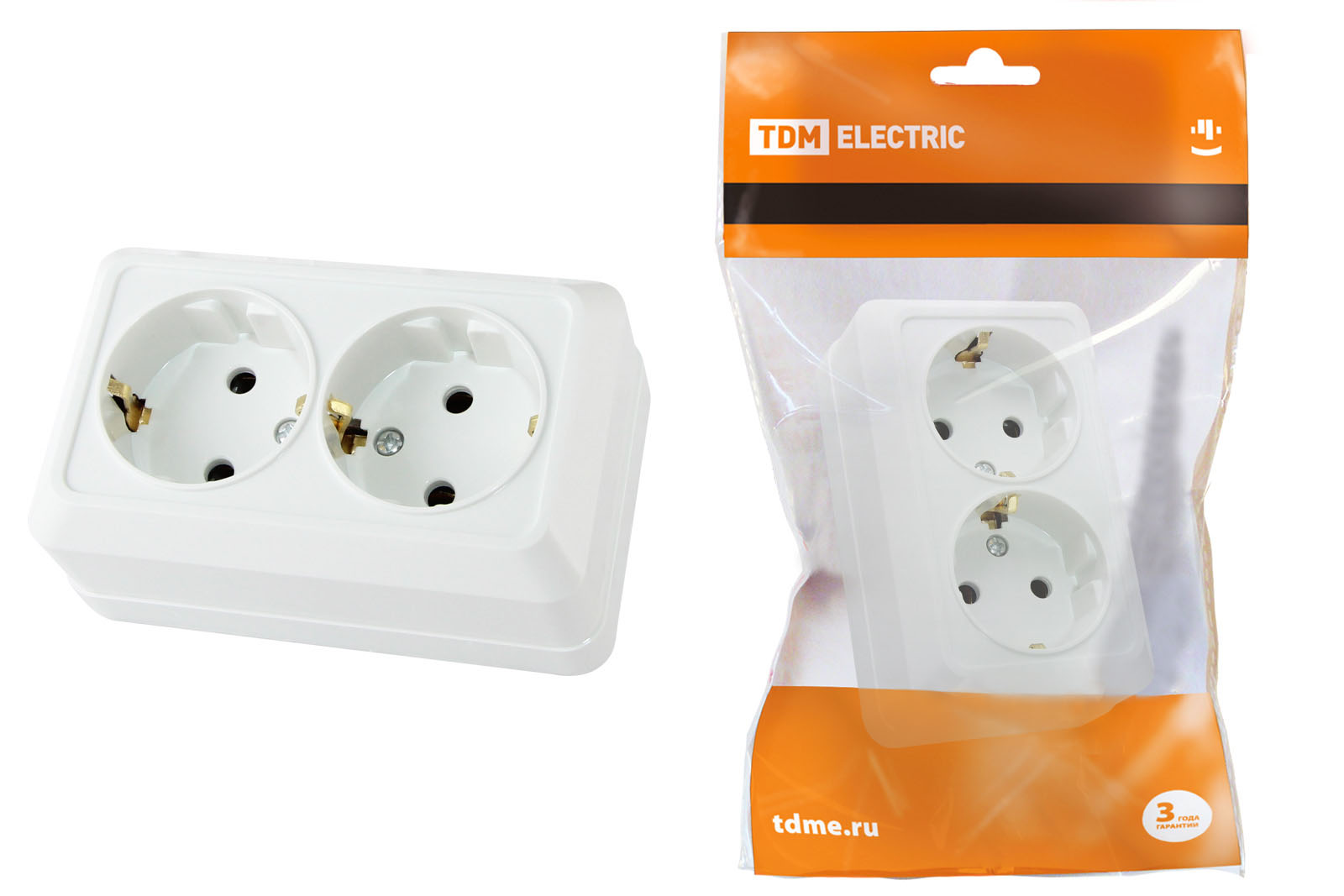 Наименование: Розетка двойная 2П+3 открытой установки IP20 16А 250В (керамика) белая "Ладога" TDM