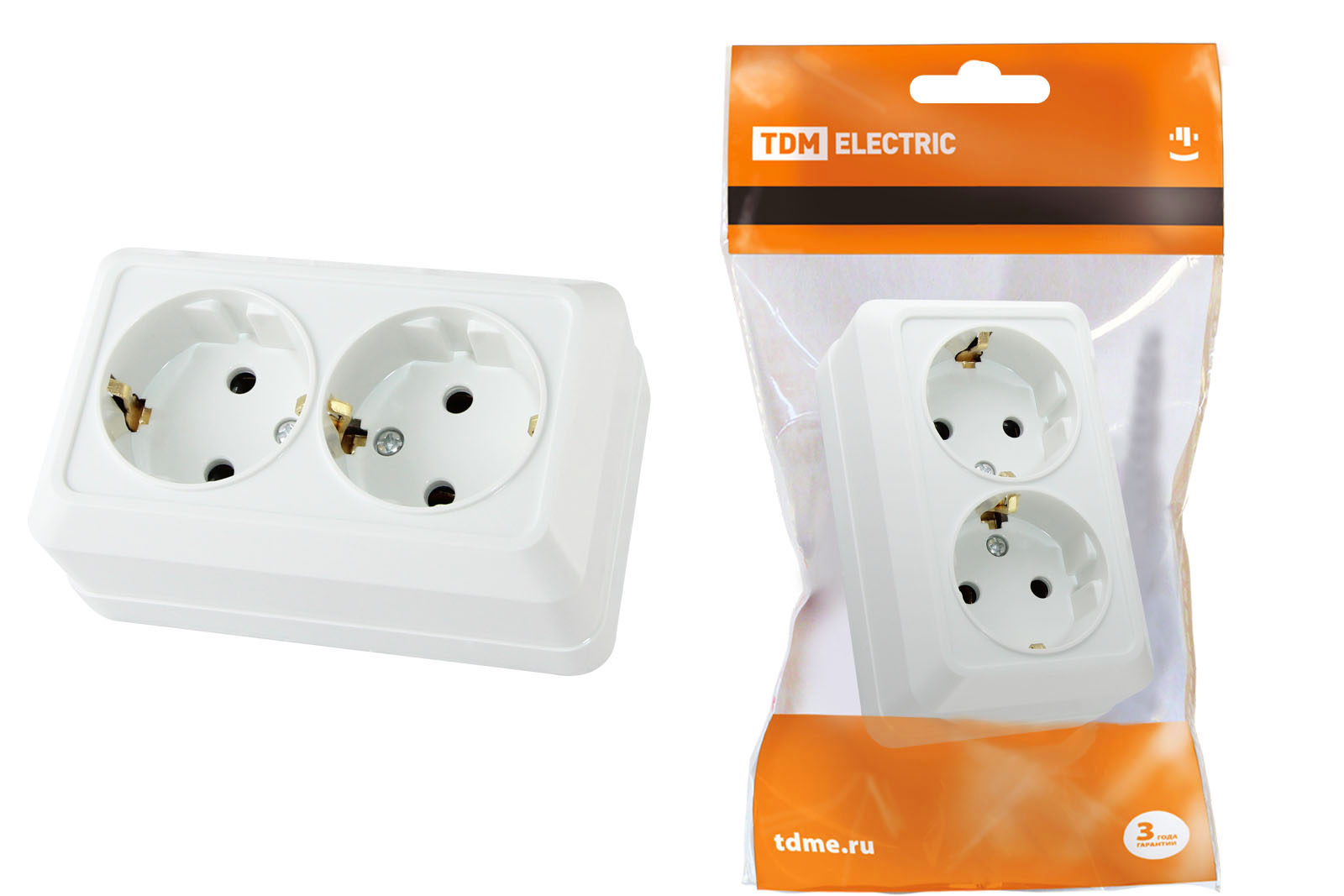 Наименование: Розетка двойная 2П+3 открытой установки IP20 16А, белая "Ладога" TDM