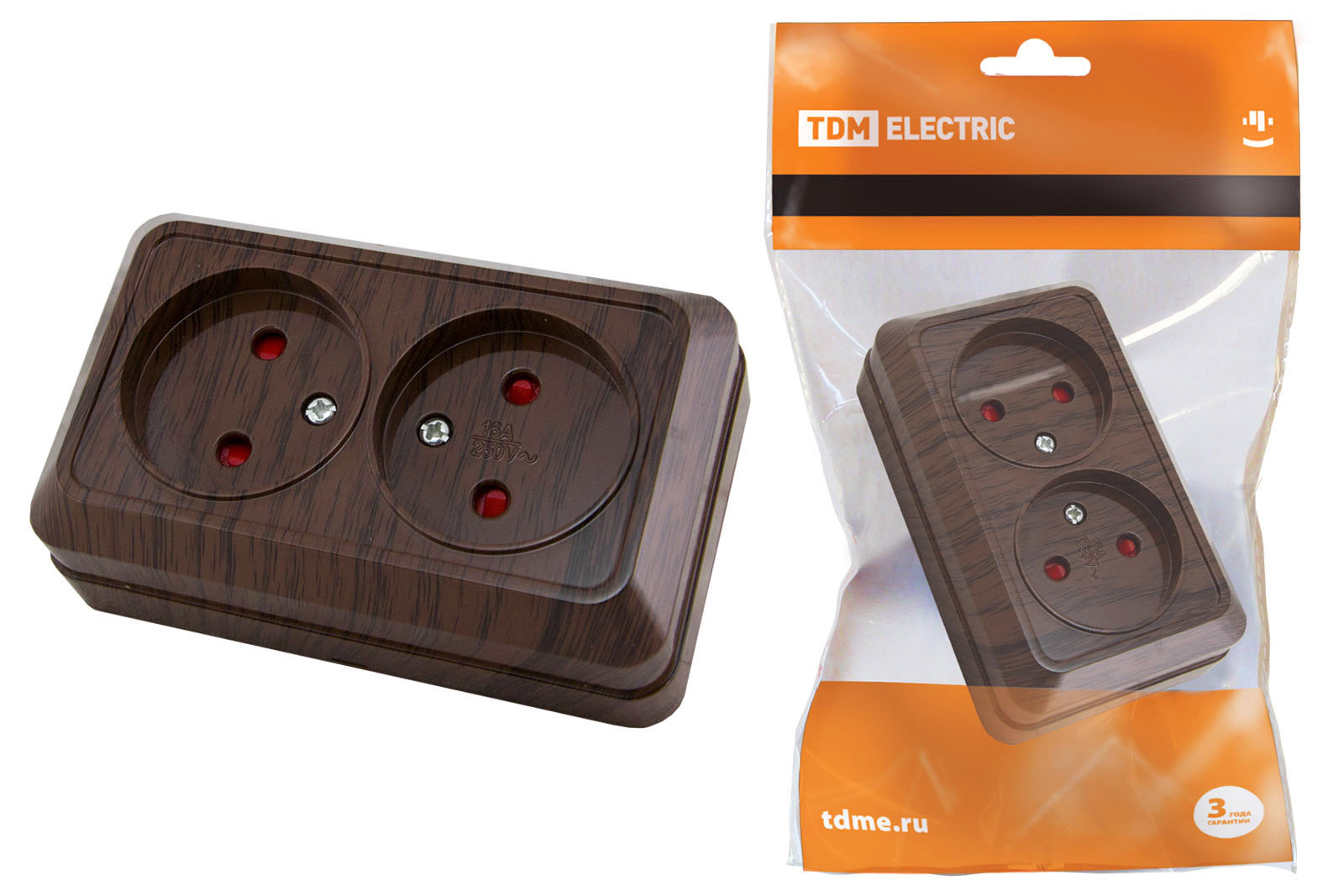 Наименование: Розетка двойная 2П открытой установки с з/ш IP20 10А, бук "Ладога" TDM