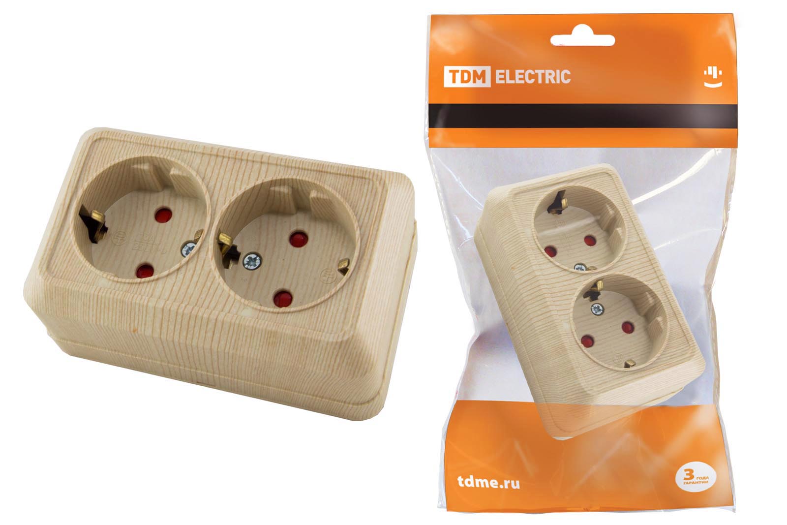 Наименование: Розетка двойная 2П+З открытой установки с з/ш IP20 16А, сосна "Ладога" TDM