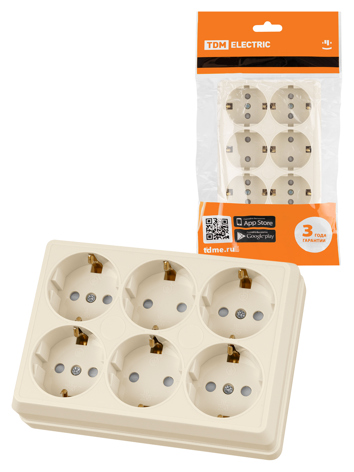 Наименование: Розетка шестиместная 2П+3 открытой установки IP20 16A с защитными шторками сл.кость "Ладога" TDM