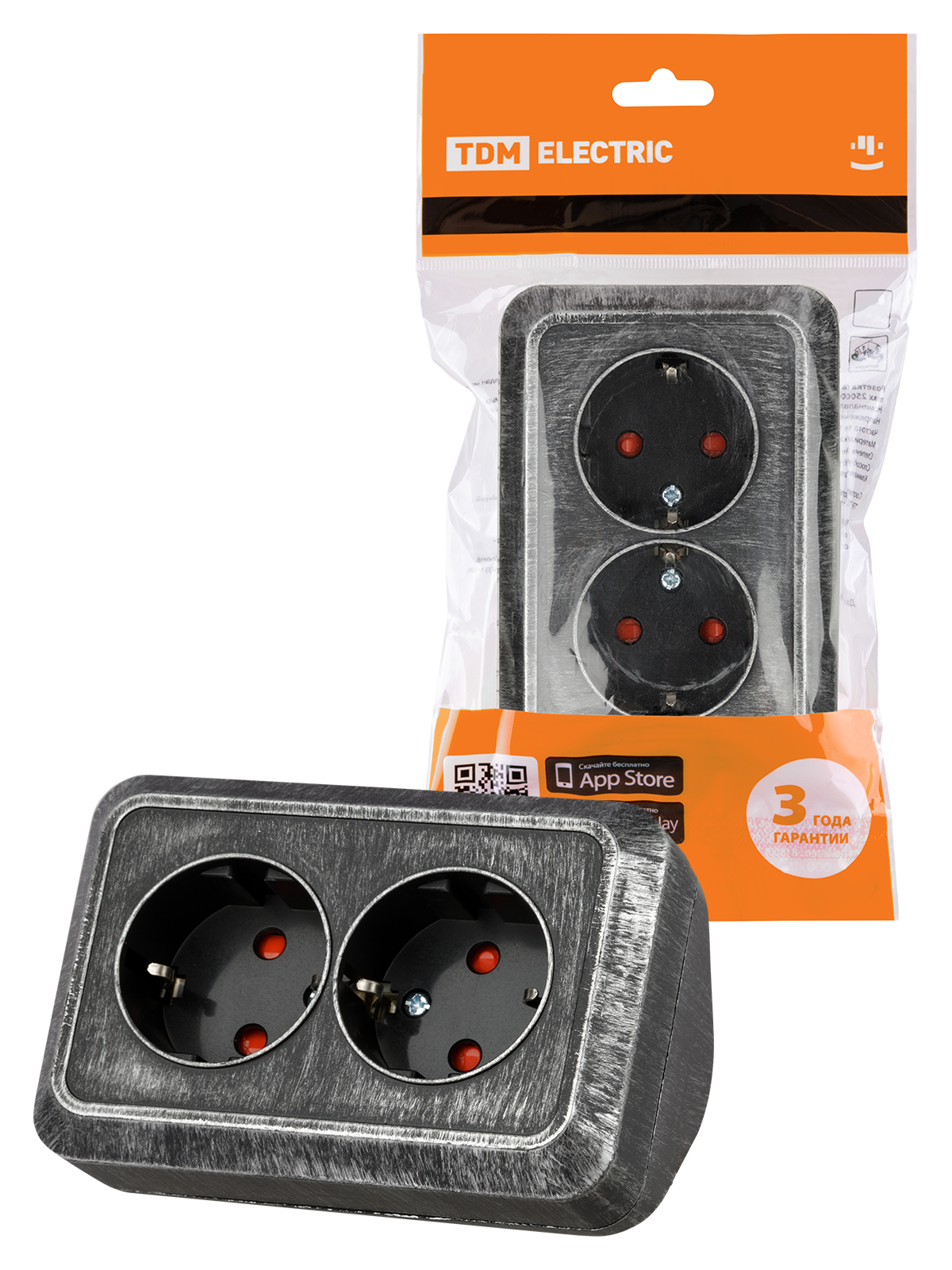 Наименование: Розетка угловая двойная 2П+3 открытой установки с з/ш IP20 250В 16А серебро "Ладога" TDM