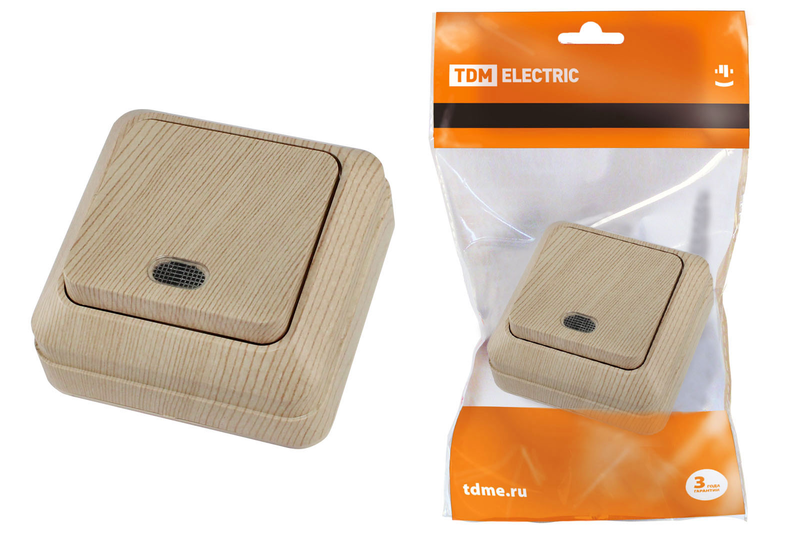 Выключатель 1-кл. открытой установки с подсветкой IP20 10А, сосна "Ладога" TDM