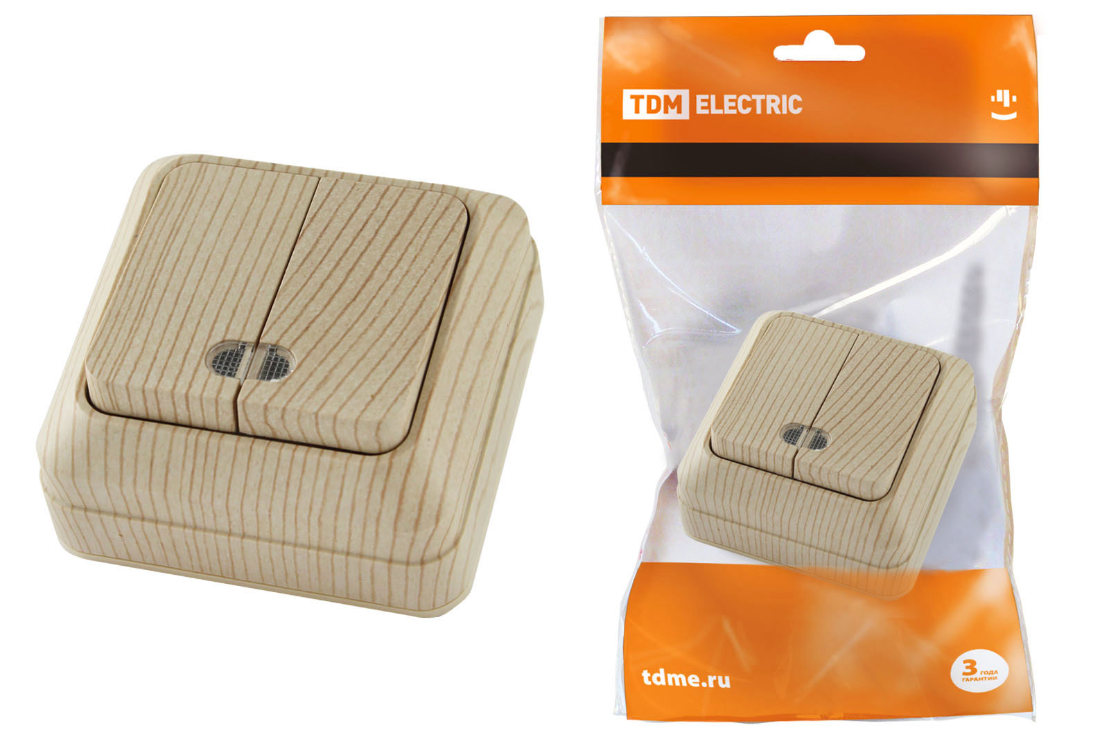 Наименование: Выключатель 2-кл. открытой установки с подсветкой IP20 10А, сосна "Ладога" TDM