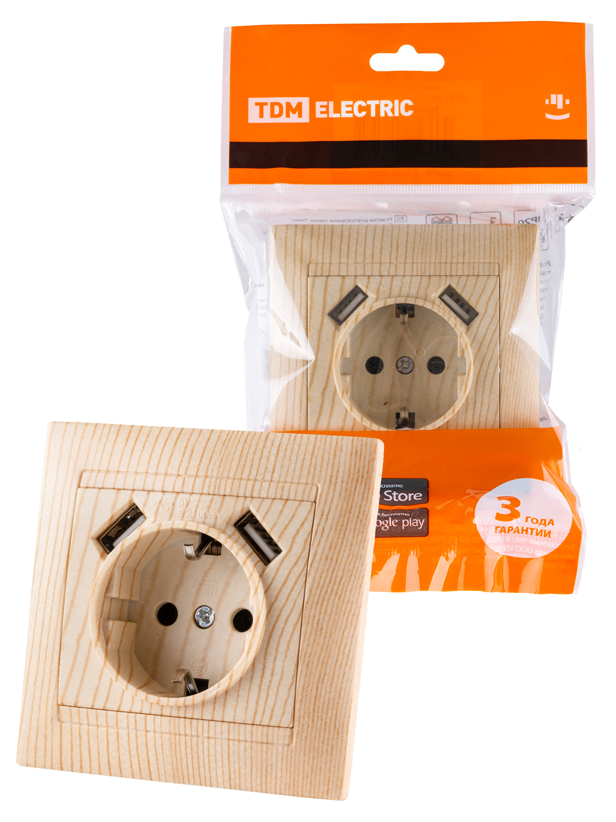 Наименование: Розетка 2П+З 16А 250В + 2 USB порта 2,1А 5В сосна "Лама" TDM
