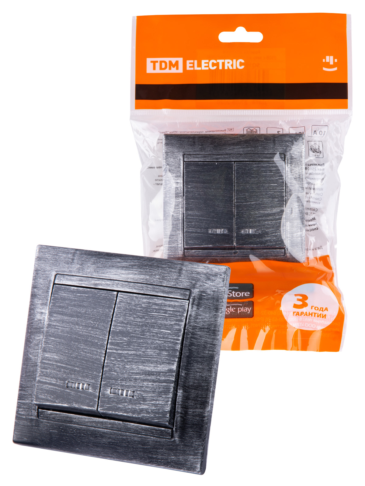Наименование: Выключатель 2 кл. с подсветкой 10А старинное серебро "Лама" TDM