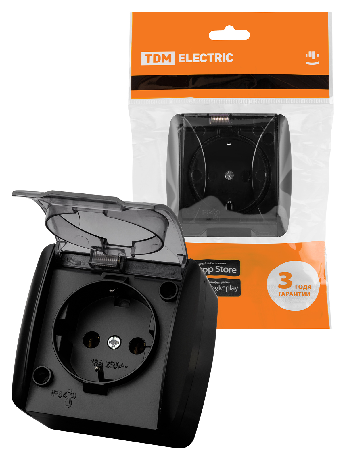 Наименование: Розетка 2П+3 открытой установки IP54 16А с прозрачной крышкой графит "Селигер" TDM
