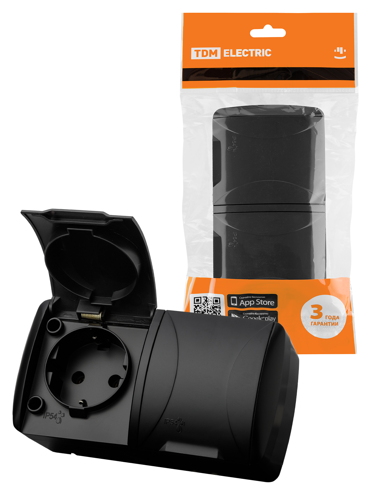 Наименование: Розетка двойная 2П+3 открытой установки IP54 16А с крышкой графит "Селигер" TDM