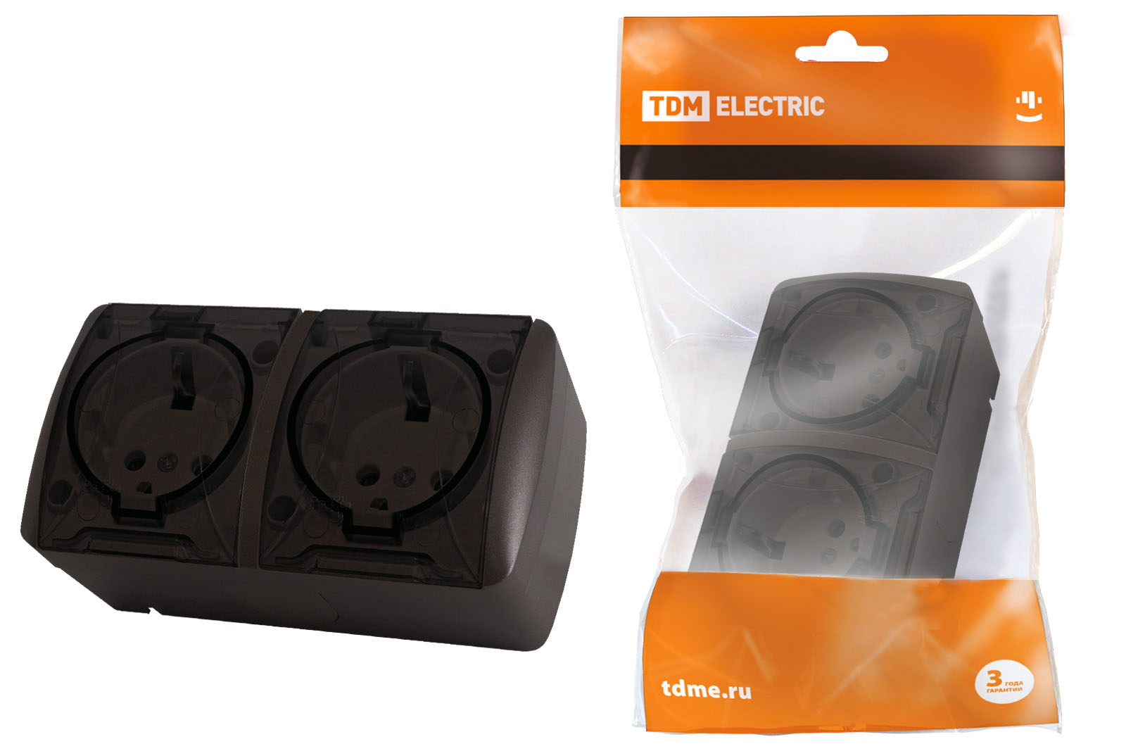 Наименование: Розетка двойная 2П+3 открытой установки IP54 16А с прозрачной крышкой шоколад "Селигер" TDM