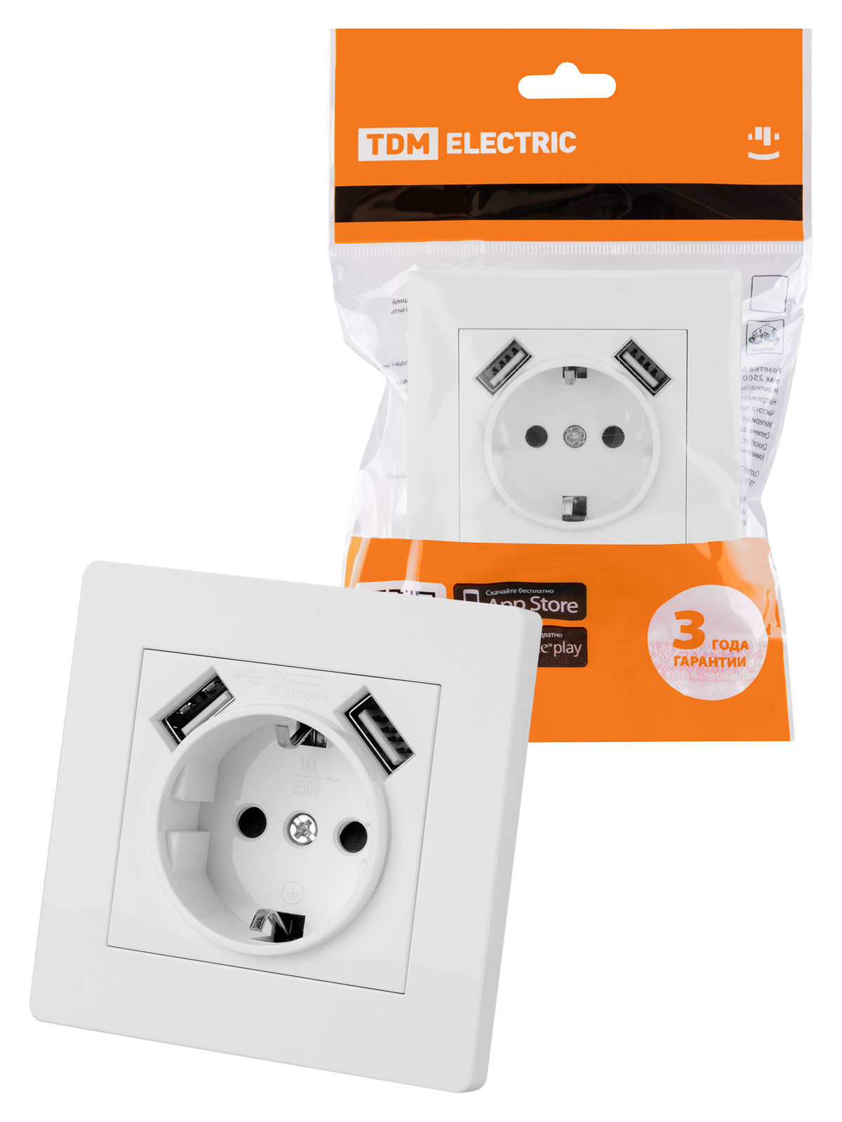 Наименование: Розетка 2П+З 16А 250В + 2 USB порта 2,1А 5В белая "Сенеж" TDM
