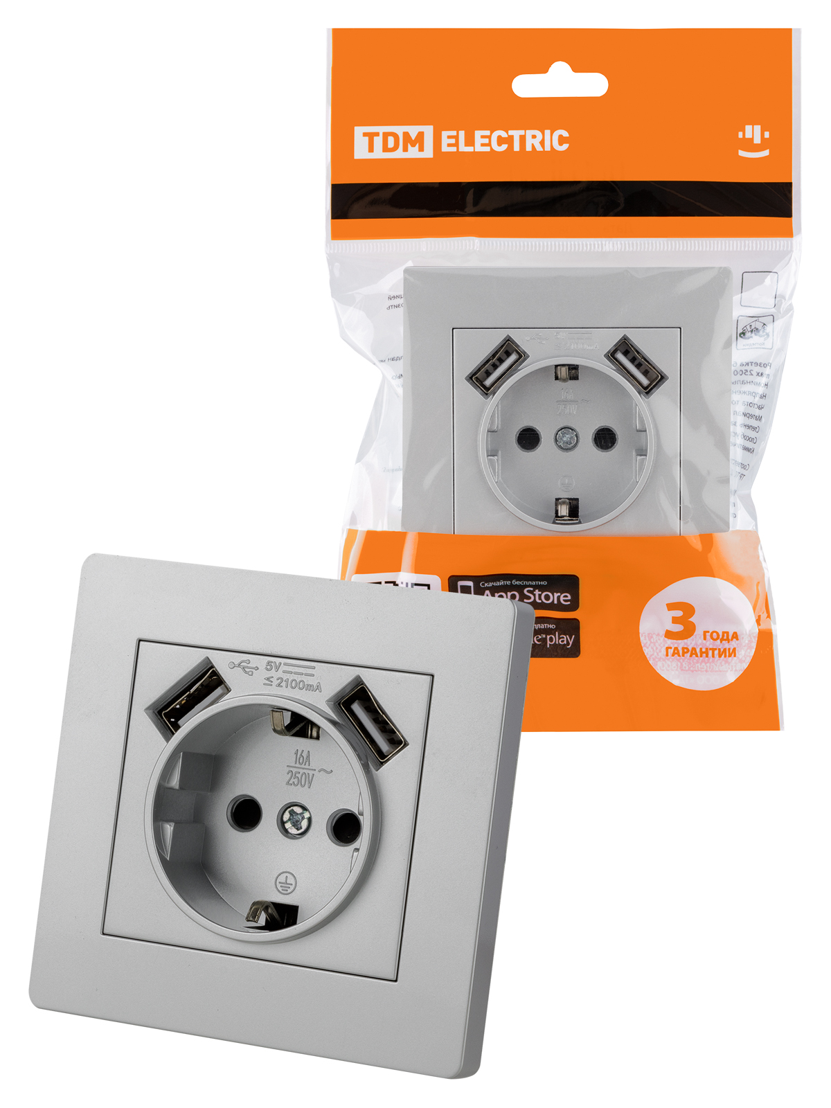 Наименование: Розетка 2П+З 16А 250В + 2 USB порта 2,1А 5В серебр. металлик "Сенеж" TDM