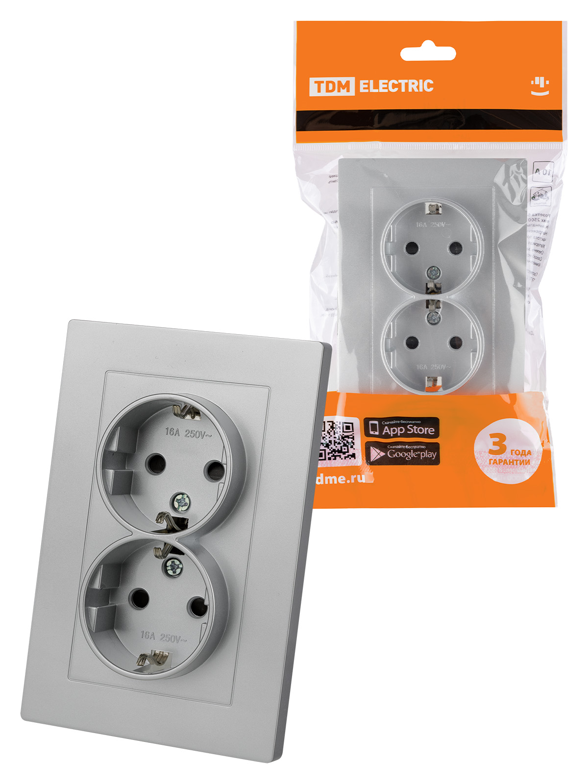 Наименование: Розетка двойная 2П+З 16А 250В с защ. шт. серебр. металлик "Сенеж" TDM