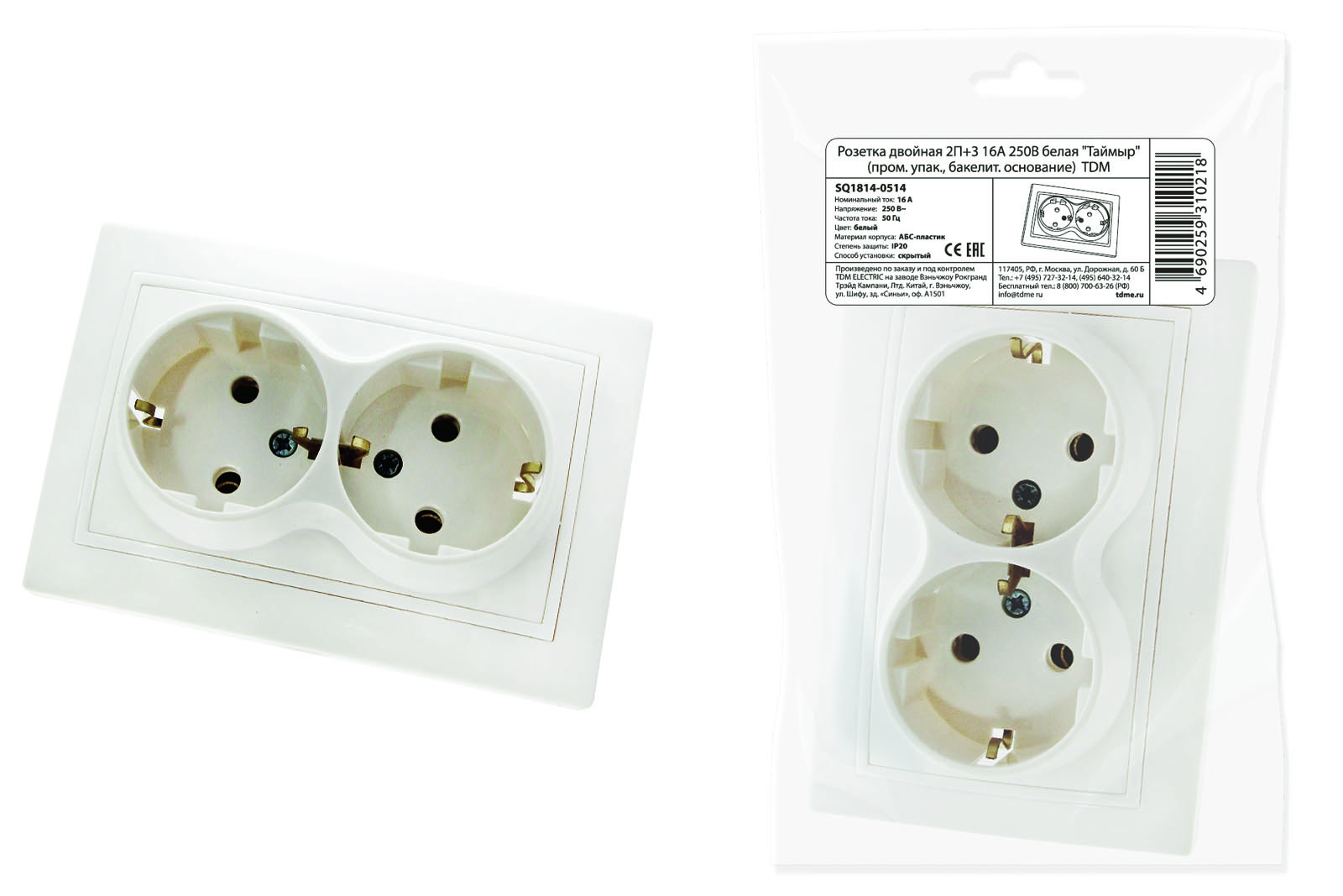 Наименование: Розетка двойная 2П+З 16А 250В белая "Таймыр" (пром. упак., бакелит. основание) TDM