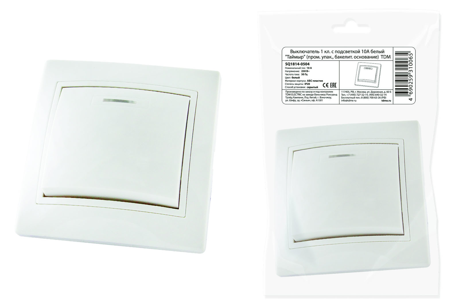 Наименование: Выключатель 1 кл. с подсветкой 10А белый "Таймыр" (пром. упак., бакелит. основание) TDM