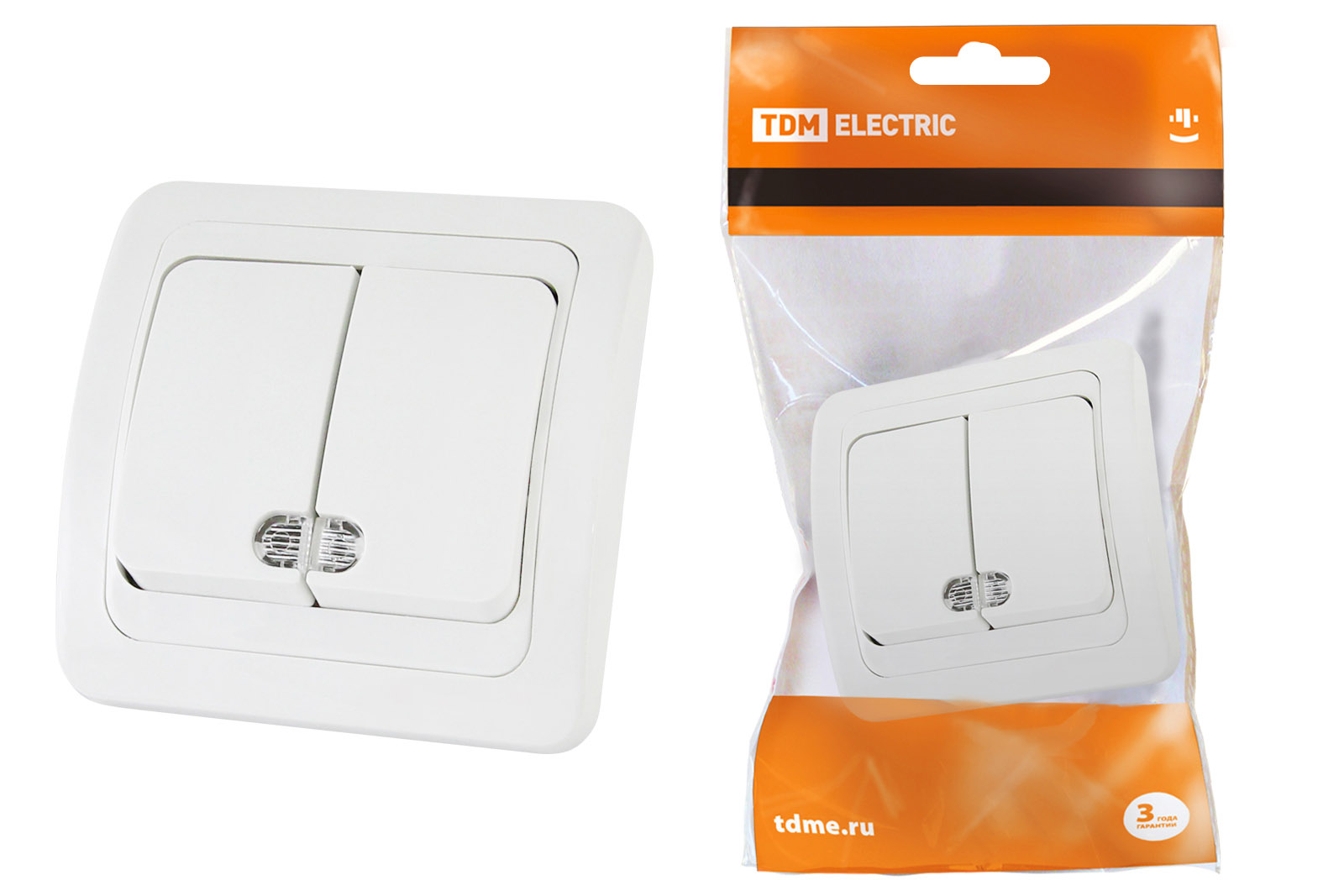 Выключатель 2-кл. с подсветкой 10А белый "Валдай" TDM