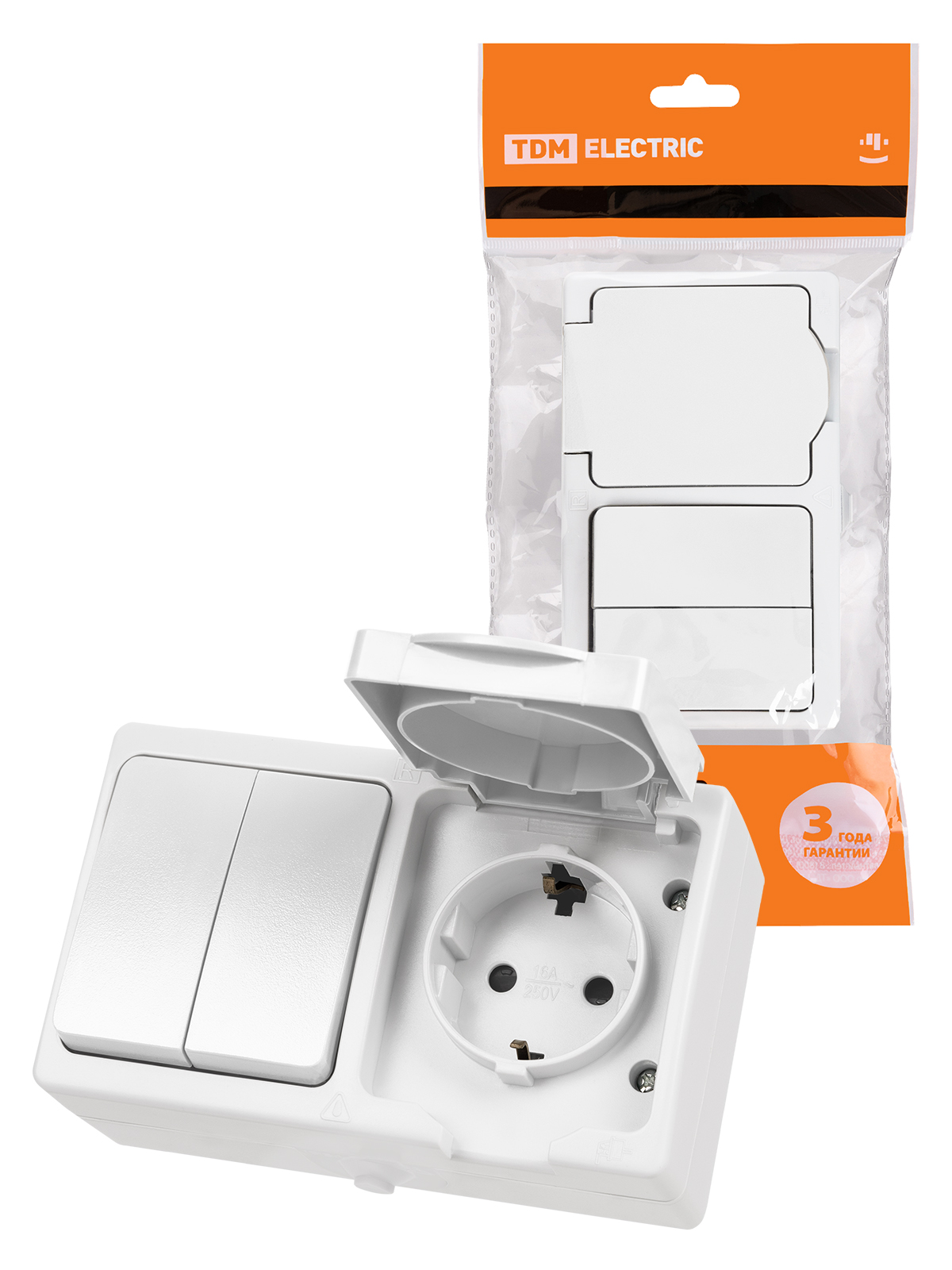 Наименование: Блок (горизонтальный) выключатель 2-кл. + розетка 2П+З с з/ш БКВР IP54 белый "Вуокса" TDM
