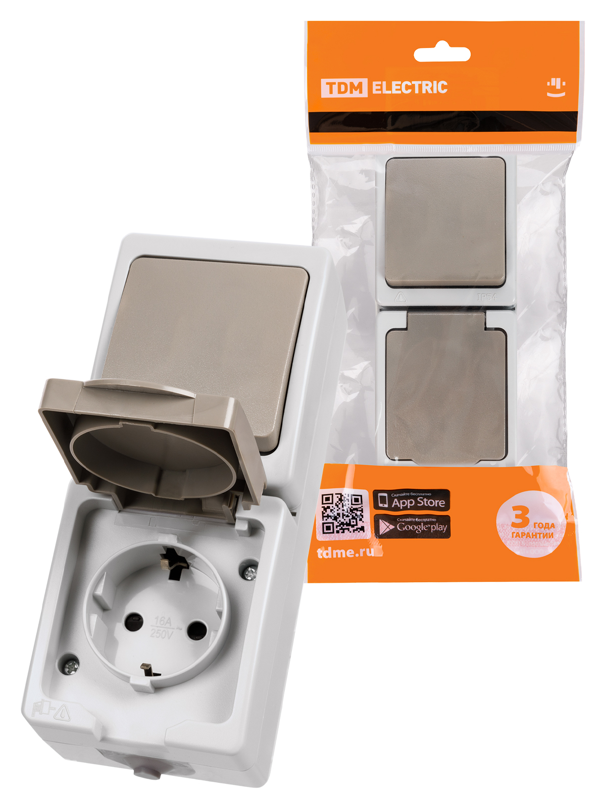 Наименование: Блок (вертикальный) выключатель 1-кл. + розетка 2П+З с з/ш БКВР IP54 серый "Вуокса" TDM