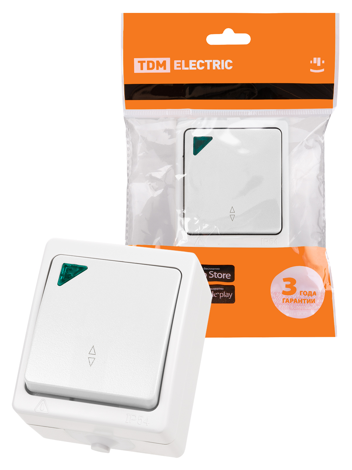 Наименование: Переключатель на 2 направления 1-кл. с подсветкой открытой установки IP54 10А белый "Вуокса" TDM