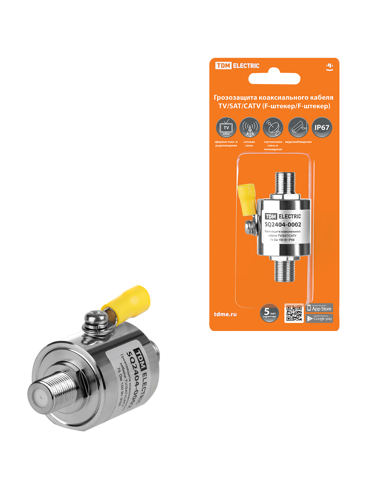 Наименование: Грозозащита коакс кабеля TV/SAT/CATV, F-штекер/F-штекер, 75 Ом, DC-3 ГГц, газ, 100Вт, с зазем, TDM