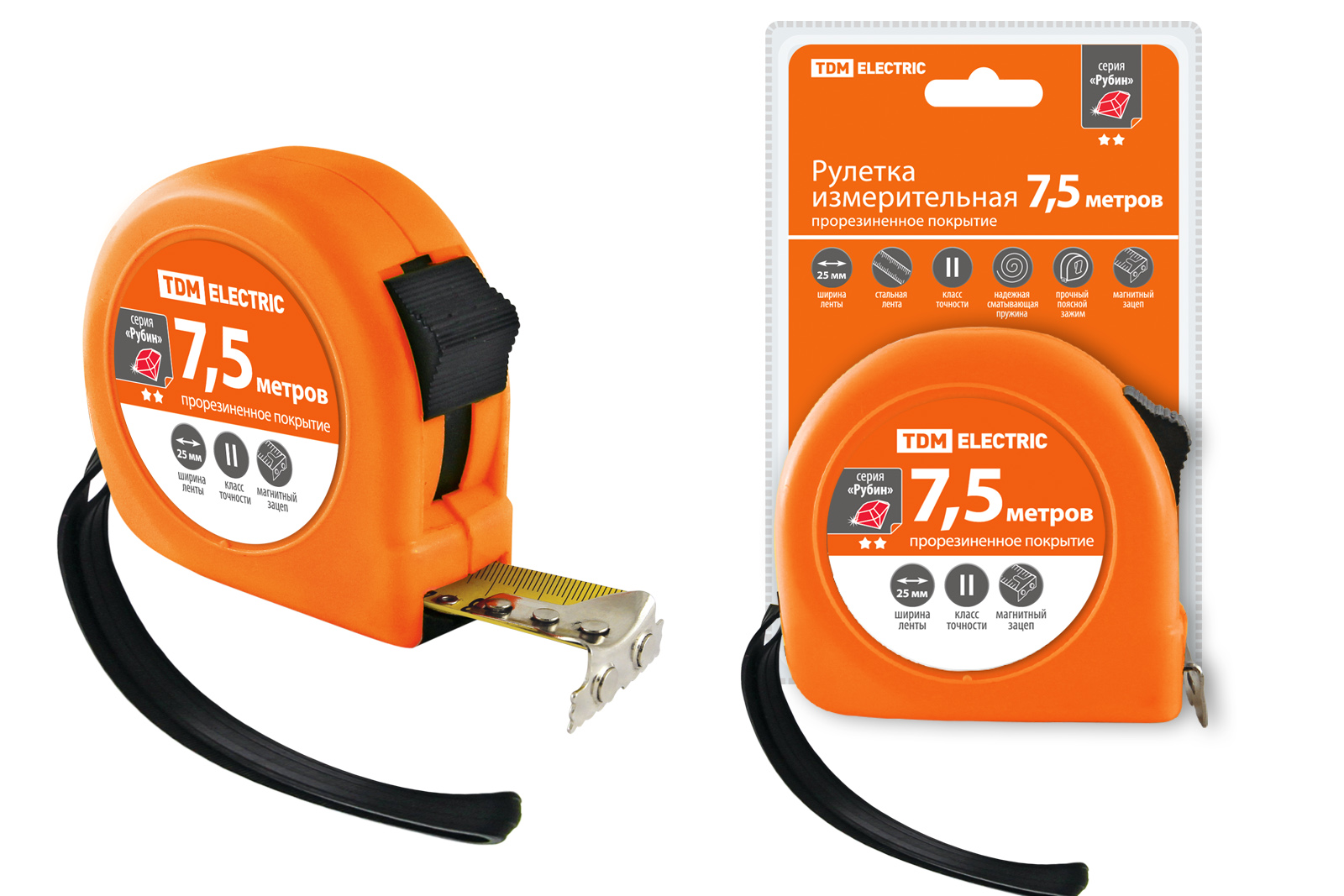 Наименование: Рулетка, длина 7.5 м, стальная лента, ширина 25 мм, прорезиненное покрытие, магнит, "Рубин" TDM