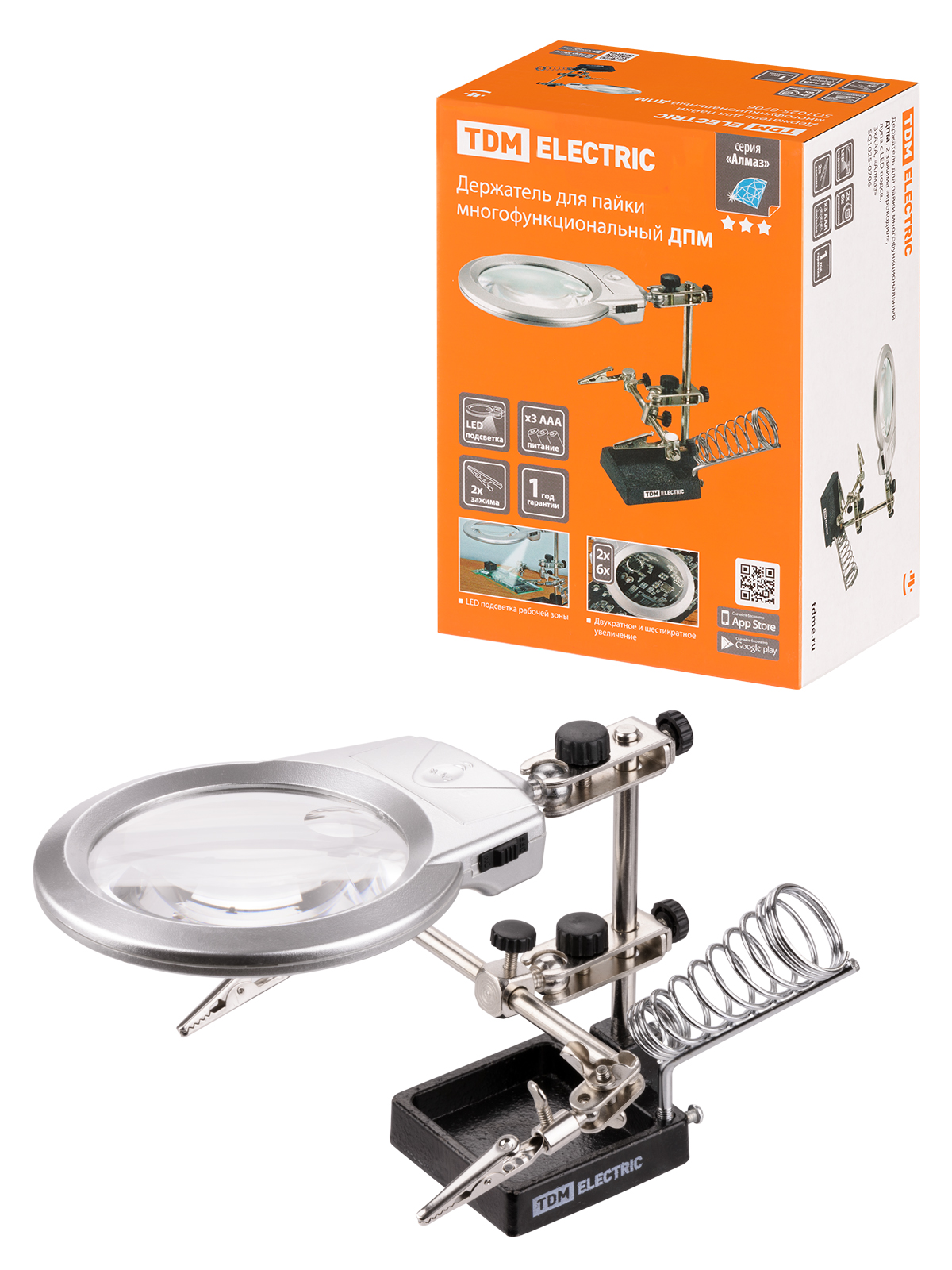 Наименование: Держатель для пайки многофункциональный ДПМ, 2 зажима "крокодил", лупа с LED подсв., 3хААА, "Алмаз"