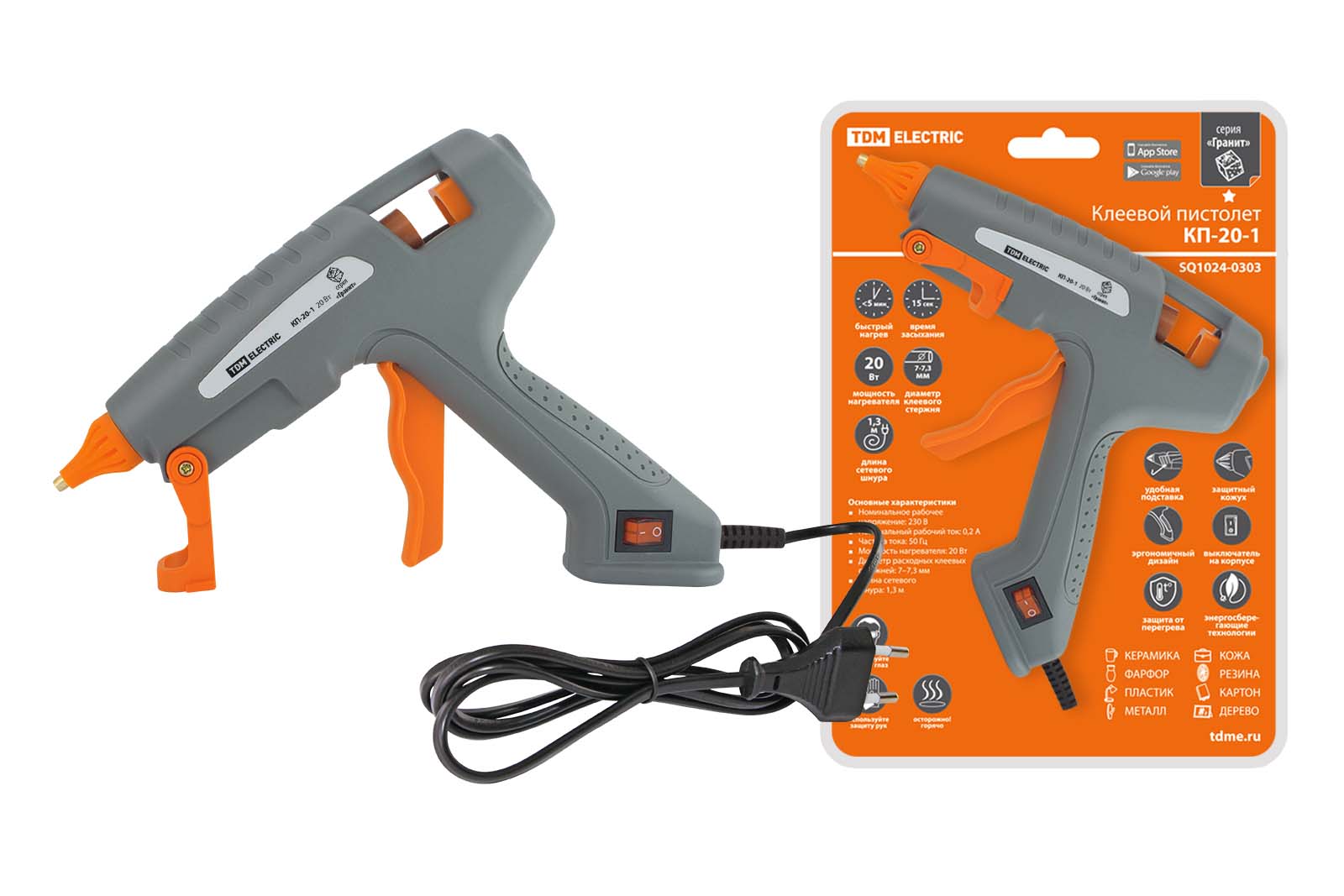 Наименование: Клеевой пистолет КП-20-1, 7 мм, подставка, выключатель, шнур 1,3 м, 20 Вт, Т=220 С "Гранит" TDM