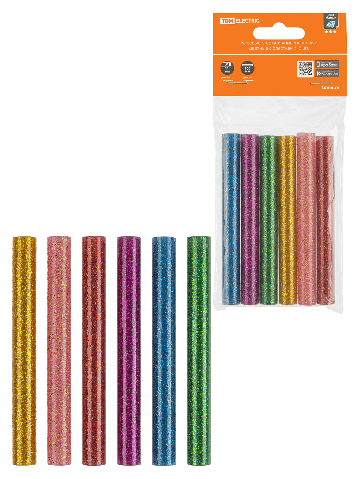 Наименование: Клеевые стержни универсальные цветные с блестками, 11 мм x 100 мм, набор 6 шт, "Алмаз" TDM