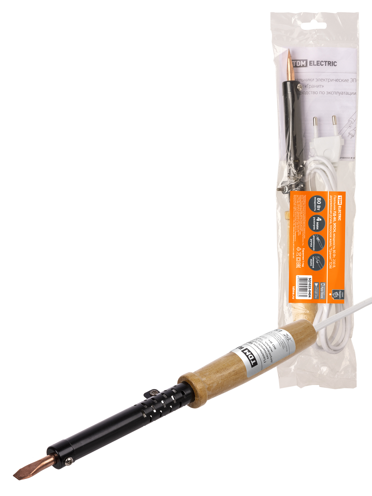 Наименование: Паяльник ПД-80, ЭПСН, мощность 80 Вт, 230 В, деревянная ручка, плоское жало, "Гранит" TDM