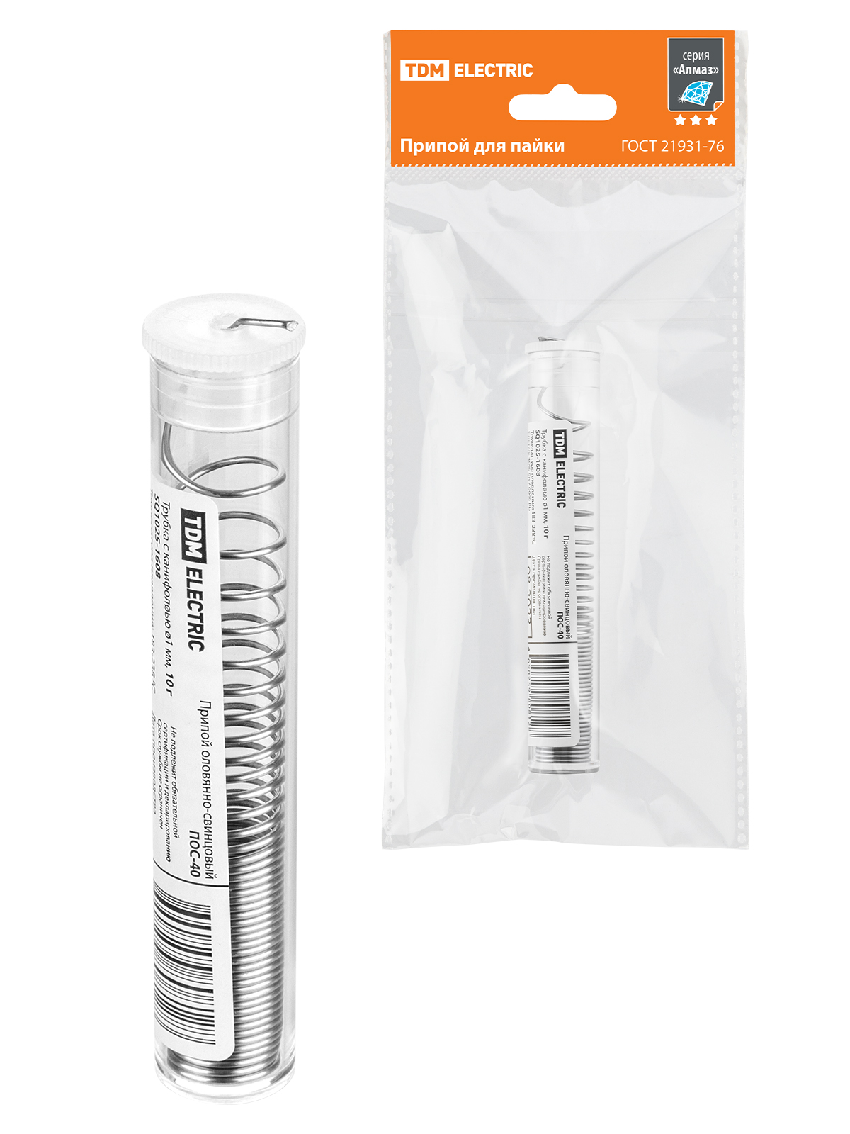 Наименование: Припой ПОС 40, трубка с канифолью, ГОСТ 21931-76, ?1 мм, 10 г, колба, серия "Алмаз" TDM