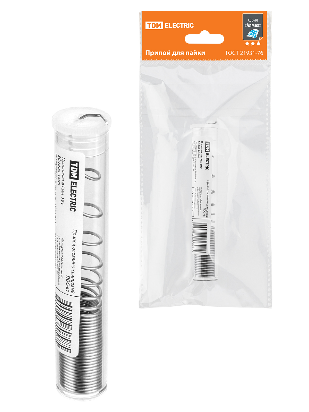 Наименование: Припой ПОС 61, проволока, ГОСТ 21931-76, ?1 мм, 10 г, колба, серия "Алмаз" TDM