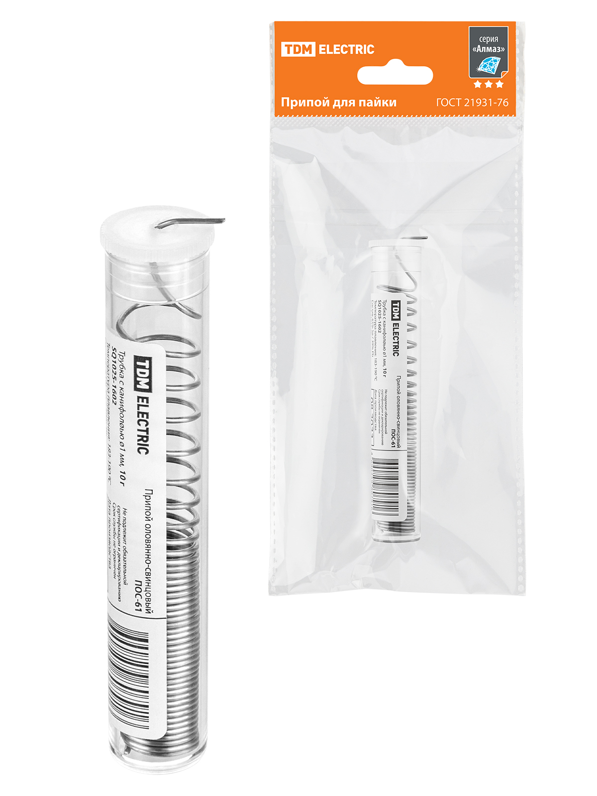 Наименование: Припой ПОС 61, трубка с канифолью, ГОСТ 21931-76, ?1 мм, 10 г, колба, серия "Алмаз" TDM