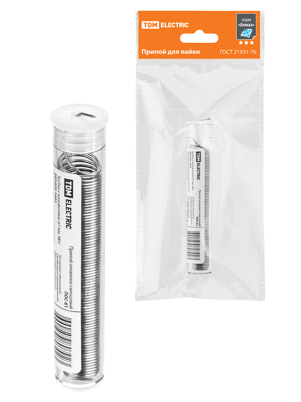 Наименование: Припой ПОС 61, трубка с канифолью, ГОСТ 21931-76, ?1 мм, 16 г, колба, серия "Алмаз" TDM