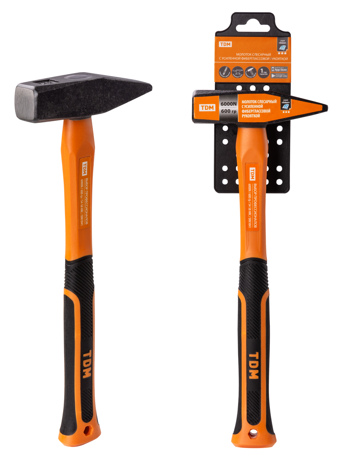 Наименование: Молоток слесарный, 600 гр, кованый, с усилен. прорезиненной фиберглассовой рукояткой "Алмаз" TDM