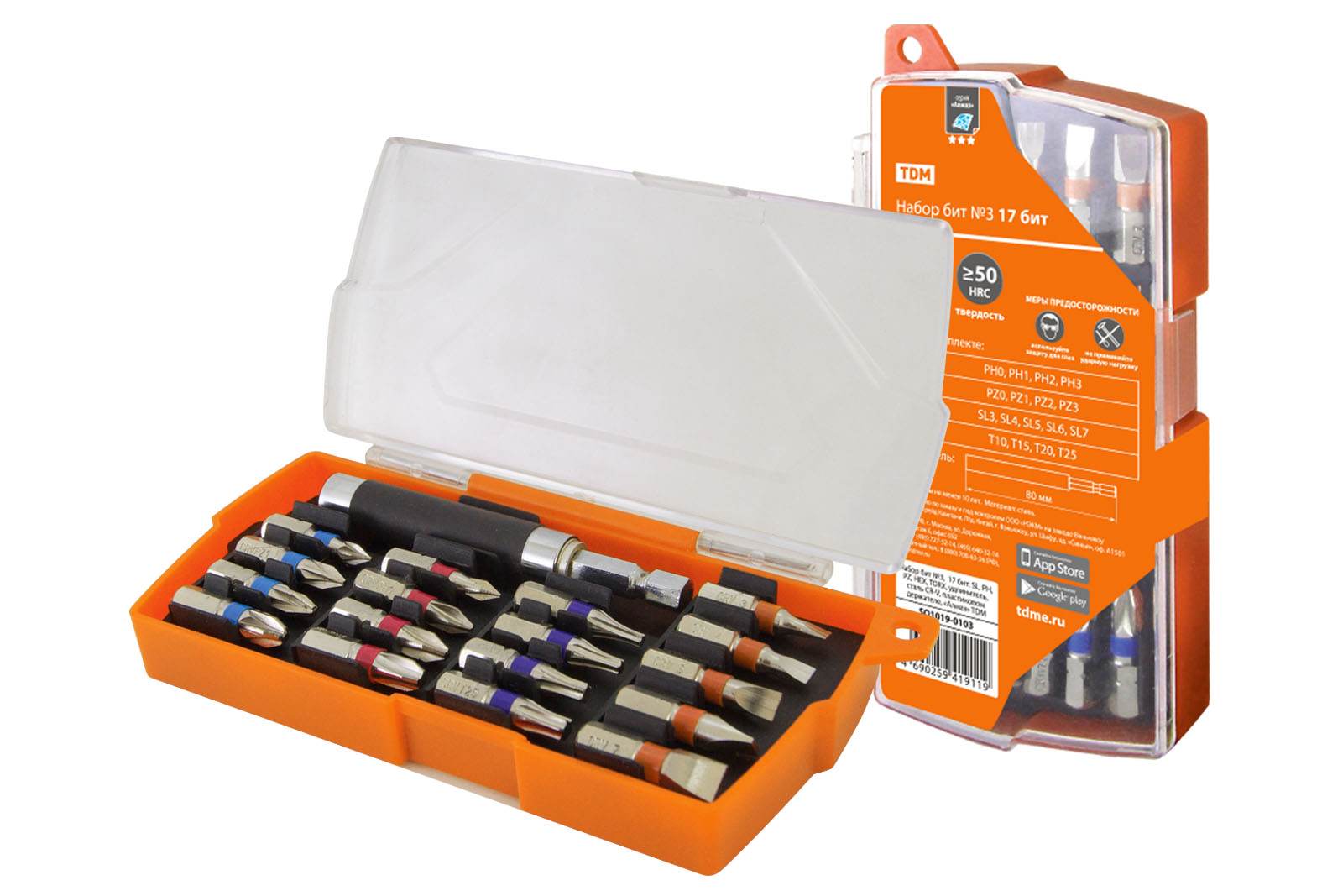 Наименование: Набор бит №3, 17 бит: SL, PH, PZ, HEX, TORX, удлинитель, сталь CR-V, пластиковом держателе, «Алмаз»