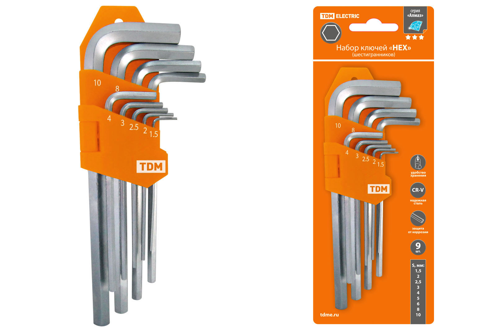 Наименование: Набор ключей "HEX" 9 шт.: 1.5-10 мм, длинные, (держатель в блистере), CR-V сталь "Алмаз" TDM