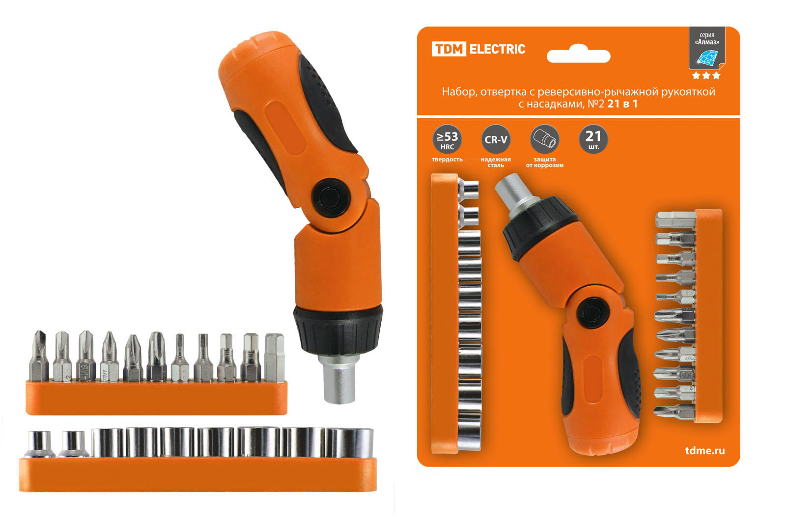 Набор, отвертка с реверсивно-рычажной рукояткой с насадками, №2, 21 предмет "Алмаз" TDM
