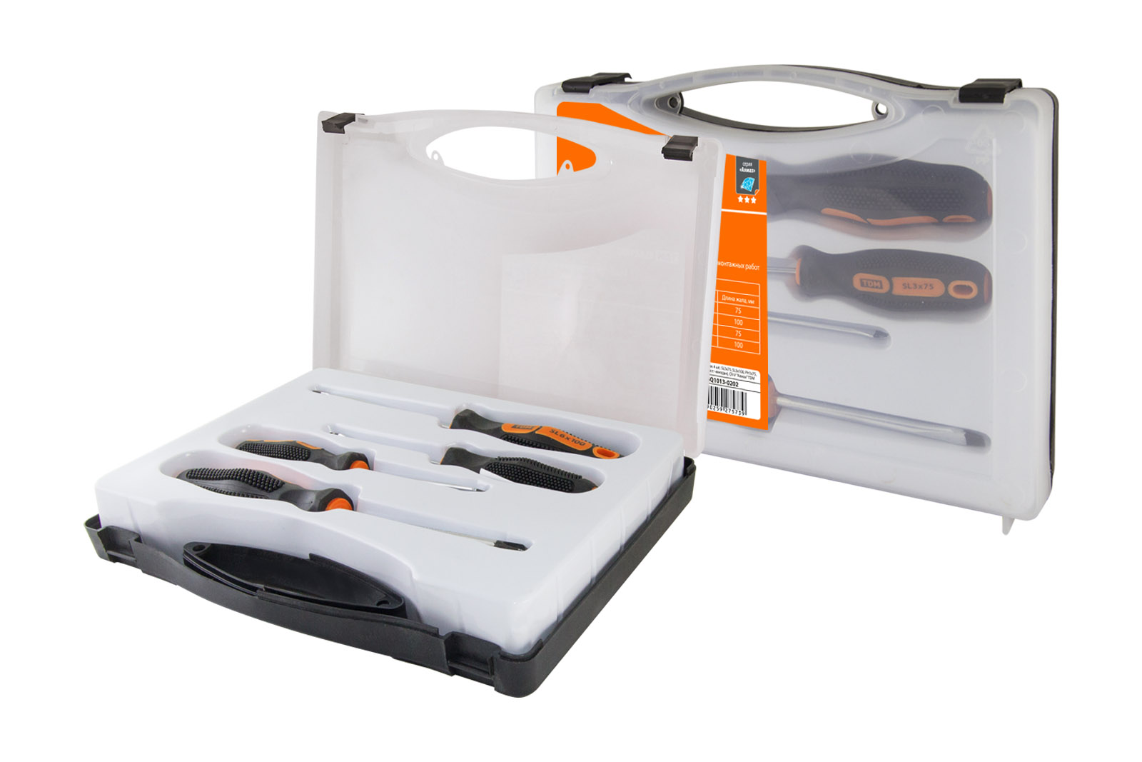 Наименование: Набор отверток 4 шт.: SL3x75, SL5х100, PH1х75, PH2х100 (пласт. чемодан), CR-V "Алмаз" TDM