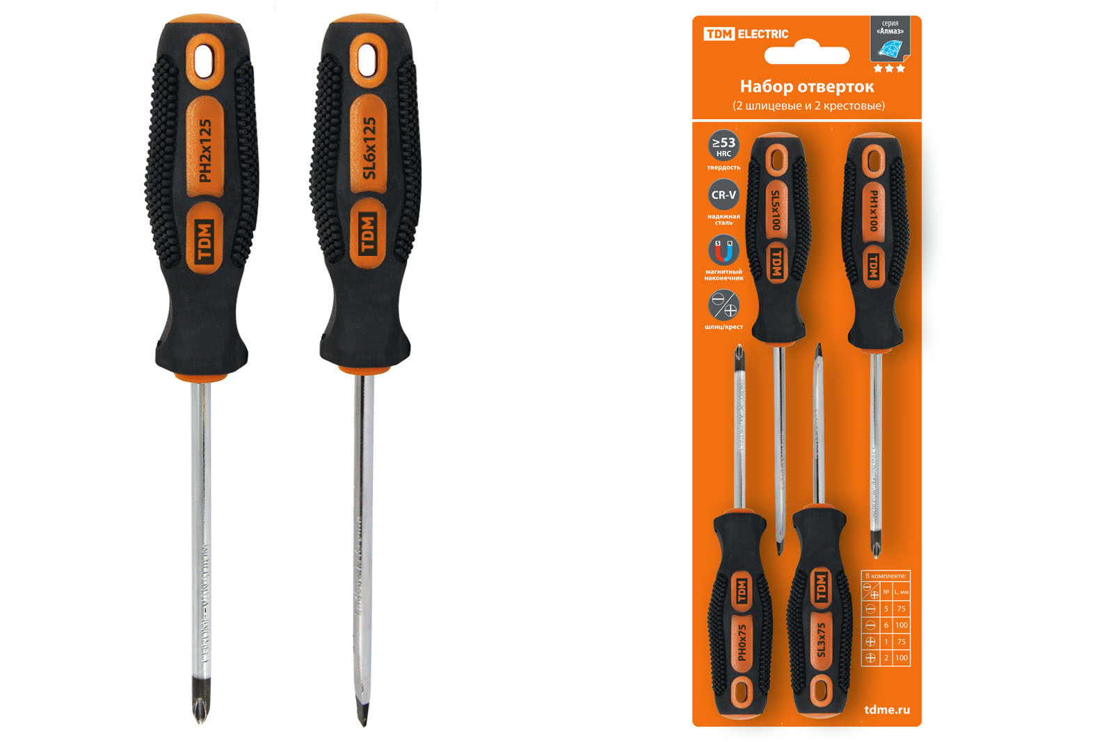 Наименование: Набор отверток 4 шт.: SL5х75, SL6х100, PH1х75, PH2х100 (блистер), CR-V "Алмаз" TDM