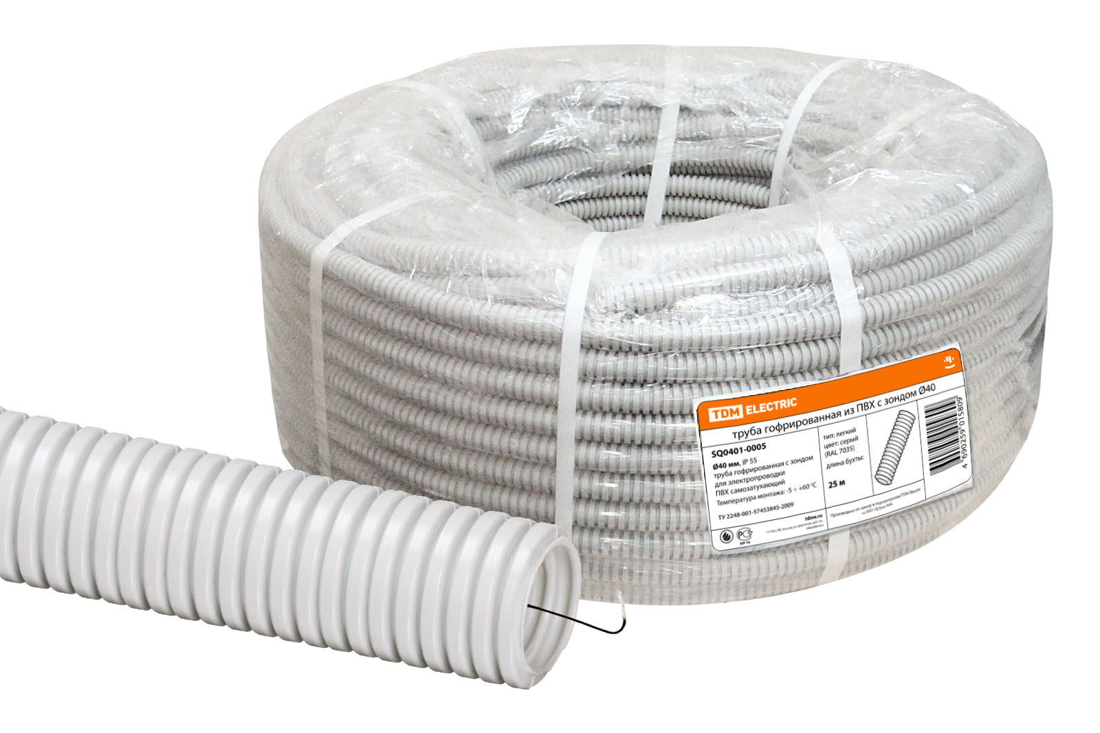 Труба гофрированная ПВХ d 40 с зондом (25 м) легкая TDM