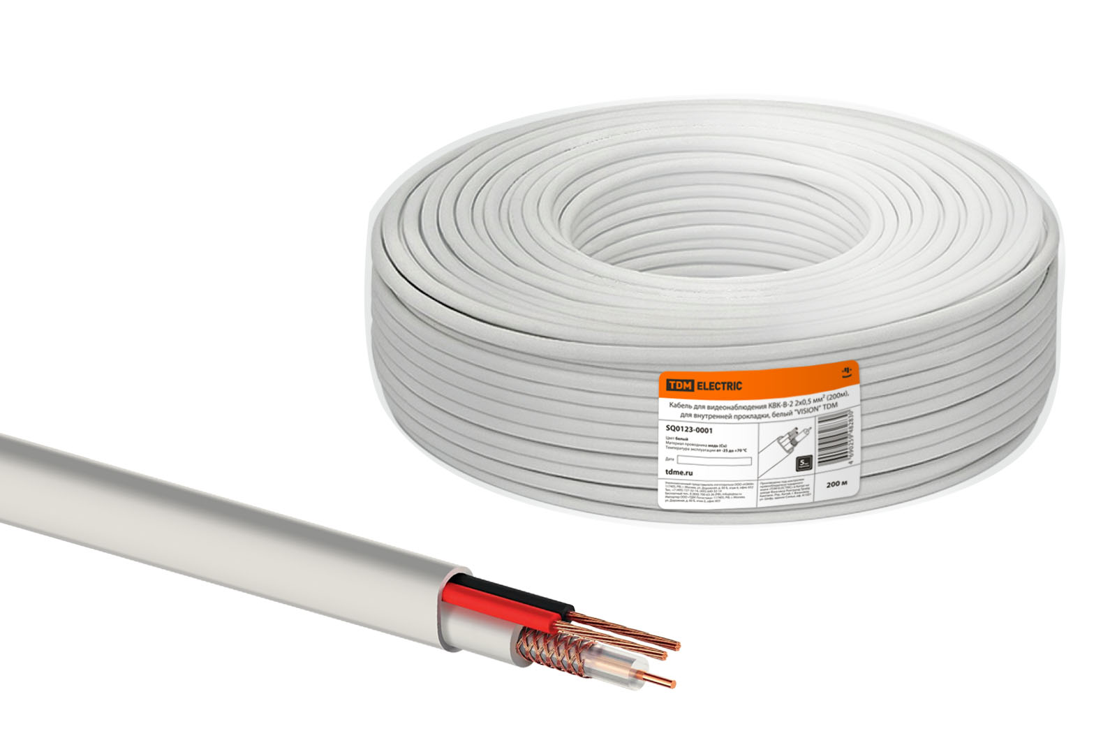 Наименование: Кабель для видеонаблюдения КВК-В-2 2х0,5 мм (200м), для внутренней прокладки, белый "VISION" TDM