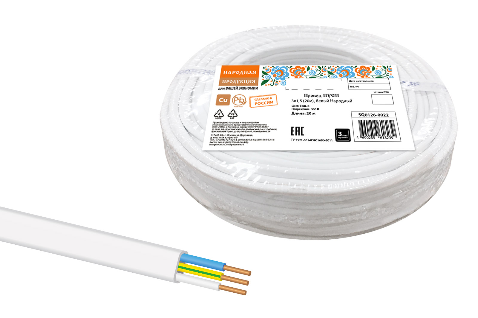 Провод ПУСП 3х1,5 (20м), белый Народный